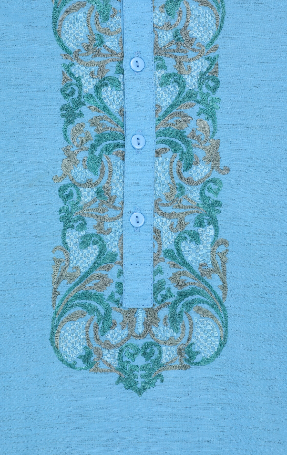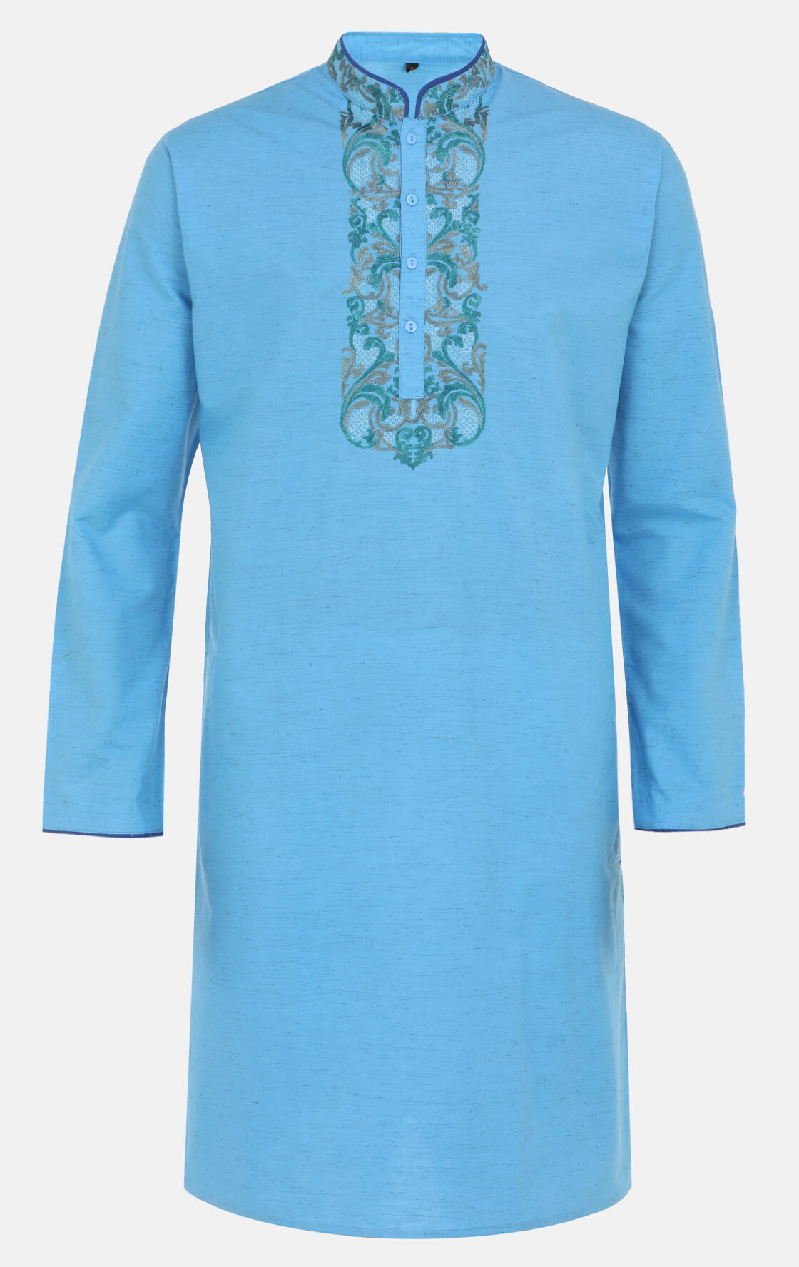 Light blue cotton panjabi with embroidery and dual side in-seam pockets. Comes with white cotton pajama with elastic waist and drawstring. Embroidery work is completed with green, grey and aqua thread.