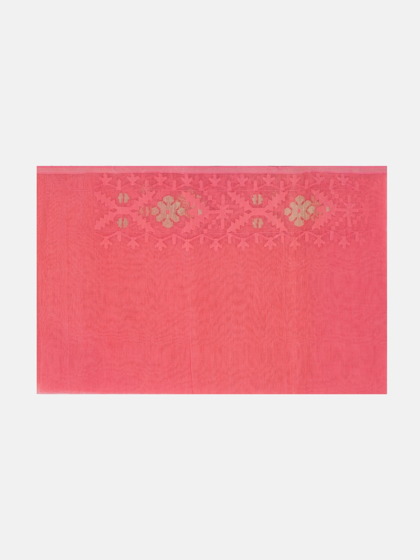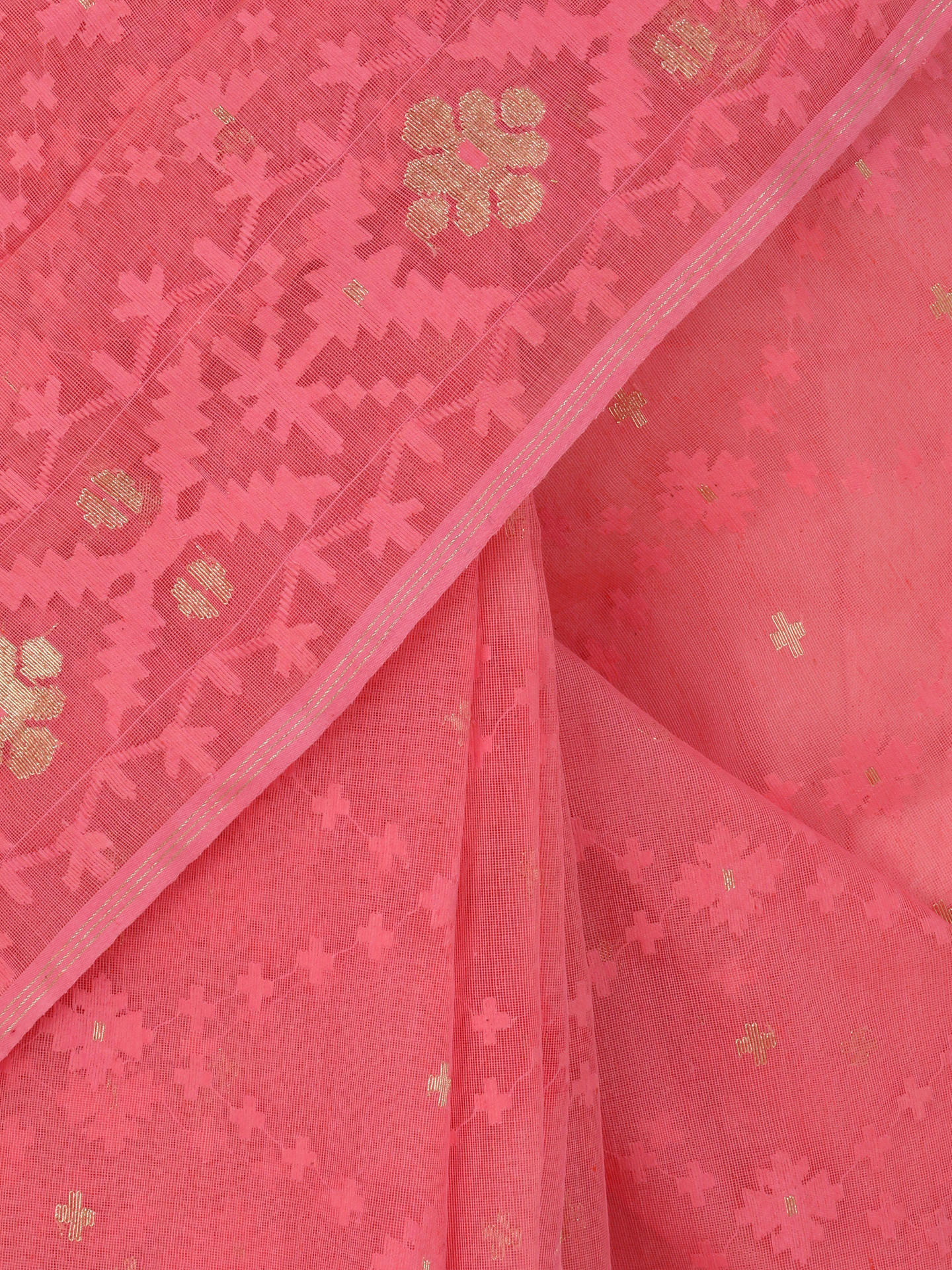 Light pink half silk jamdani saree with golden and light pink buti. Comes with matching separate unstitched blouse piece.