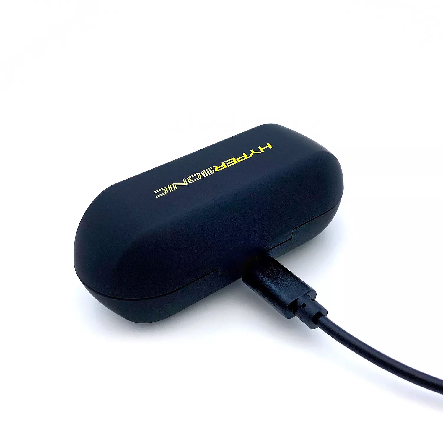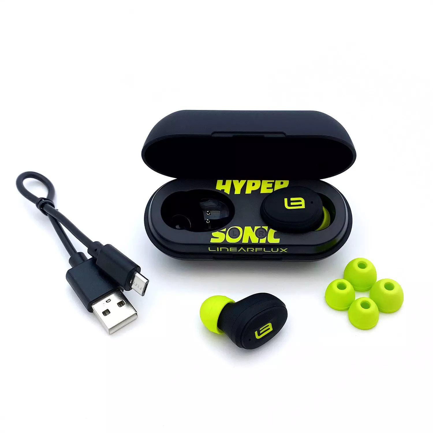 HyperSonic DX High-Performance True Wireless HD Headphones. Designed for everyday use, the HyperSonic DX headphones provide users with premium sound features and unmatched ergonomic comfort and performance, including a capacitive touch control, Qi wireless recharging capability and a selection of four different size ear tips -- all for a breakthrough affordable price. Impactful High-Definition Audio Created by the same engineers that led the development team behind the hyper-successful Beats® by Dr. Dre headphone brand, the LinearFlux DX headphones feature the company’s third generation LinearFlux Hyper Definition 3D Sound Driver that delivers an impactful high-definition audio experience, with all the detail, dynamics, and rich bass response demanded by today’s music lovers. Ideally tuned for enjoying popular HD streaming services by Apple Music, Spotify, and Pandora, listeners enjoy 360-degree Surround Sound, with stage imaging for the ultimate in realism and sonic power. Importantly, Linear Flux’s HyperSonic DX Wireless Technology featuring no drop-out signal technology and Hyper Fast Bluetooth 5.0 pairing means you never need wires to enjoy all your favorite music. Users enjoy up to 6-8 hours playtime per charge, and up to 25 hours with the charging case Additionally, 5 minutes of HyperCharging in the charging case provides an additional 1 hour of playtime.