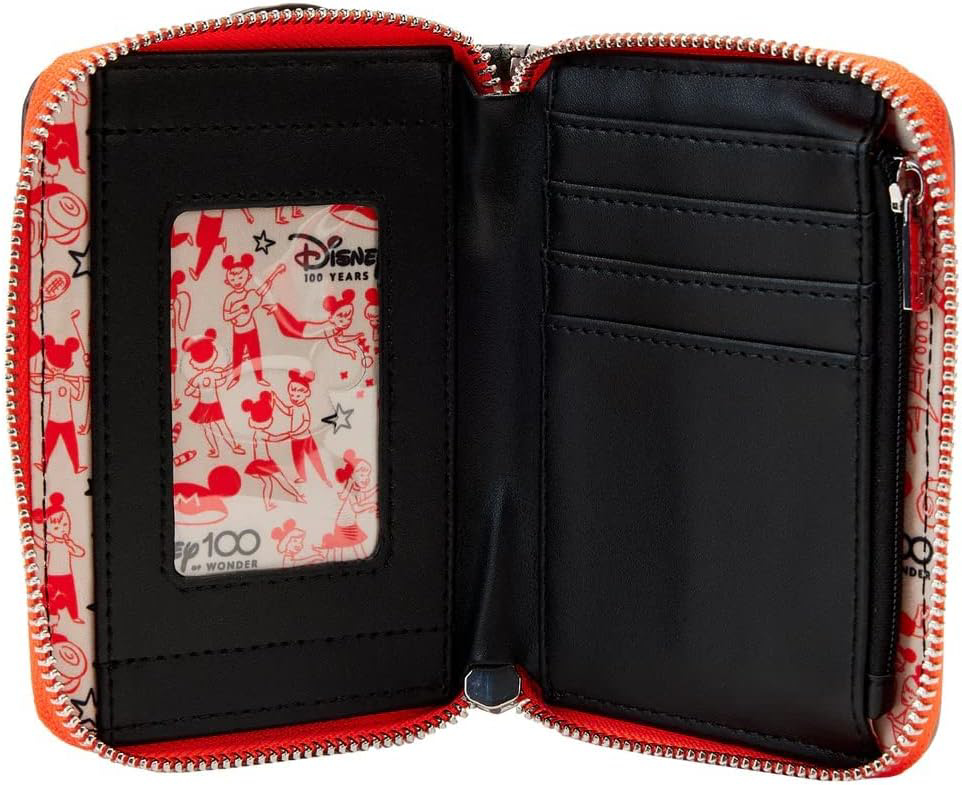 The Loungefly Disney100 Mickey Mouse Club Zip Around Wallet is made of vegan leather (polyurethane). Wallet zips closed with sturdy metal hardware and includes four slots for holding cards with a clear slot to hold ID. Additional features include applique, embroidered, and printed details. Take note of the coordinating inside lining.