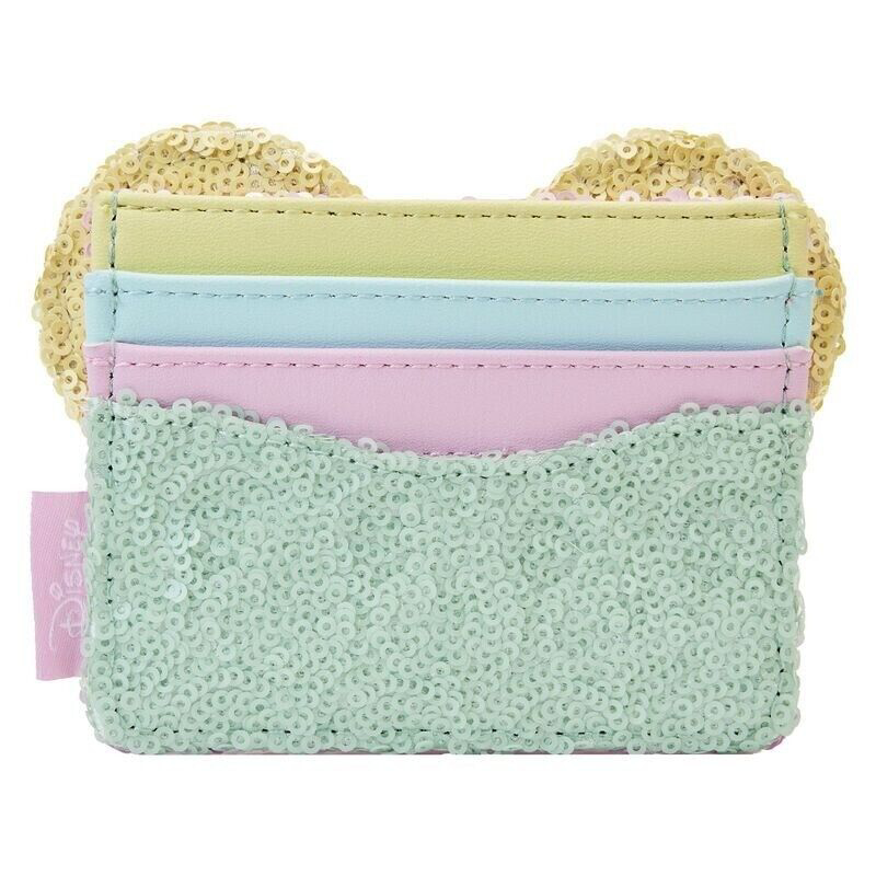 Take an extra sparkly bow! Shine with our exclusive Loungefly Disney Minnie Mouse Pastel Card Holder. Minnie Mouse’s signature 3D applique bow, on the front of this accessory, is covered in blue sequins. Her pastel yellow sequined ears pair perfectly with an array of glittery soft colors on all sides. On the reverse side, you’ll find 3 slots for holding cards. It’s the perfect accessory for showing off your sparkling personality while turning everyday outings into enchanting adventures. Act fast to collect this 1,750-piece limited edition Loungefly exclusive.