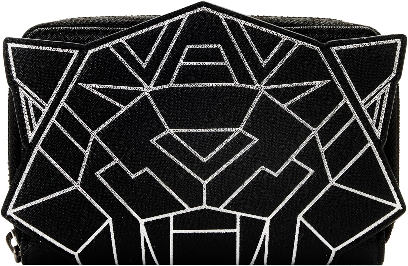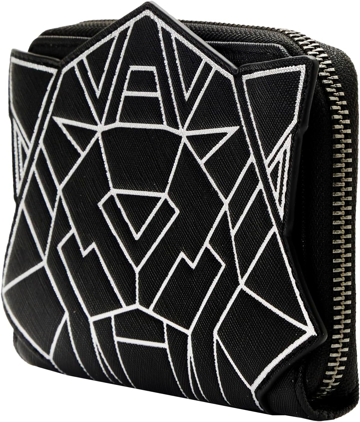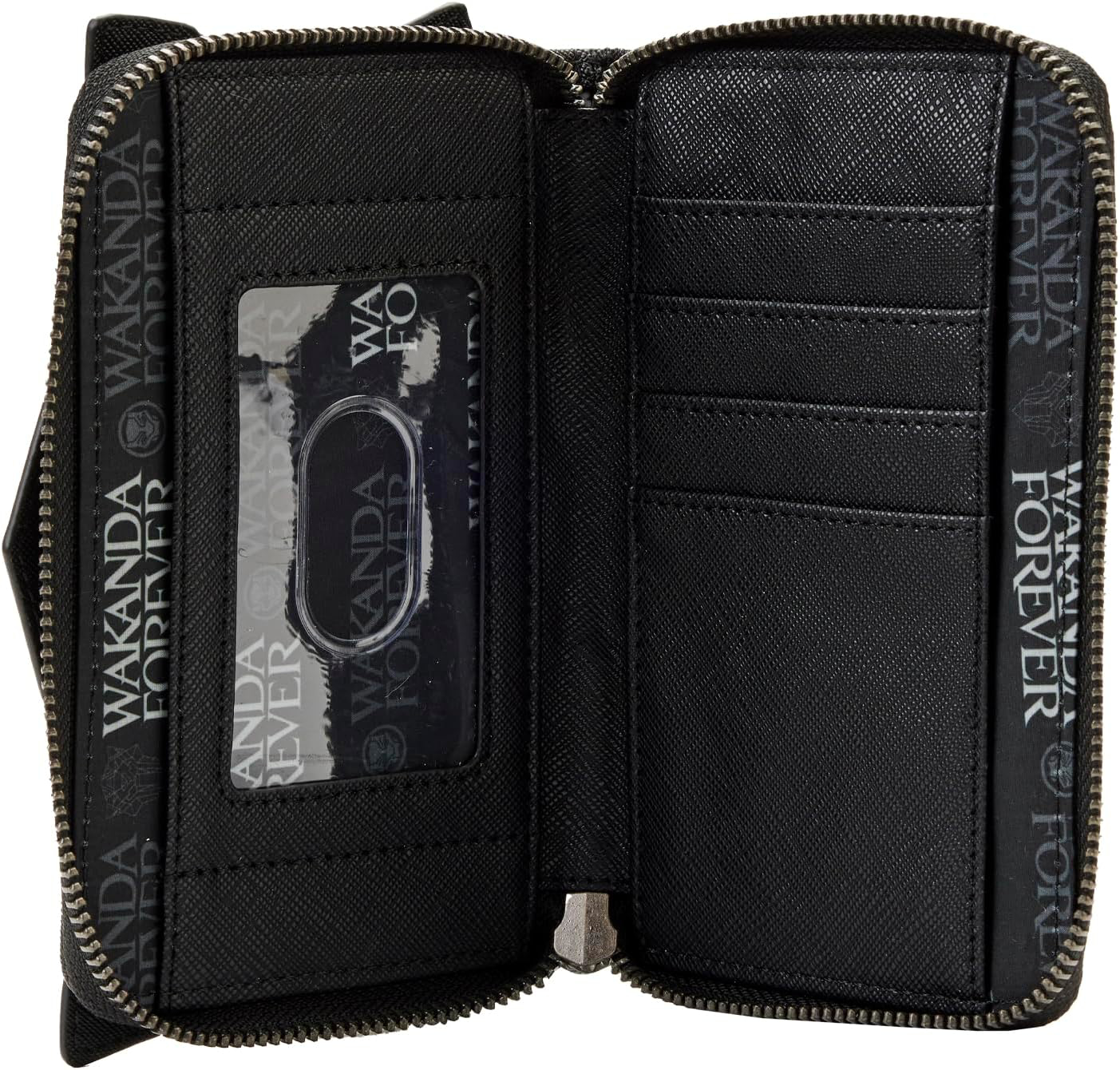 Rise and embrace the legacy of Wakanda. The Loungefly Black Panther: Wakanda Forever Zip Around Wallet uses a unique geometric design to form the shape of a roaring black panther. On the front, silver outlines of geometric shapes create the image of a panther as it bares its teeth. Turn the wallet around to find a Wakandan-inspired design. With four slots for holding cards and a clear slot for holding ID, this heroic accessory will keep your belongings safe on any mission.