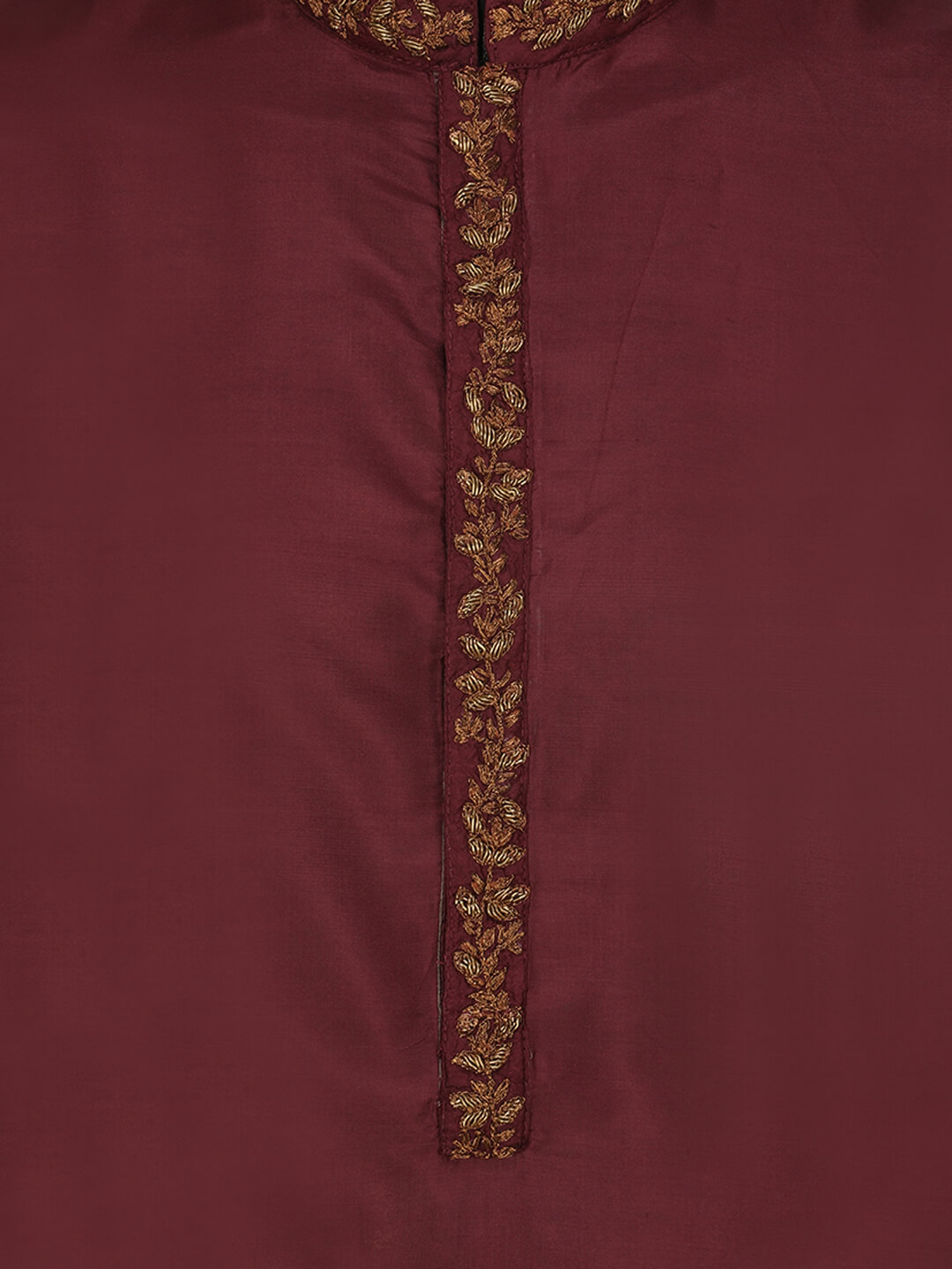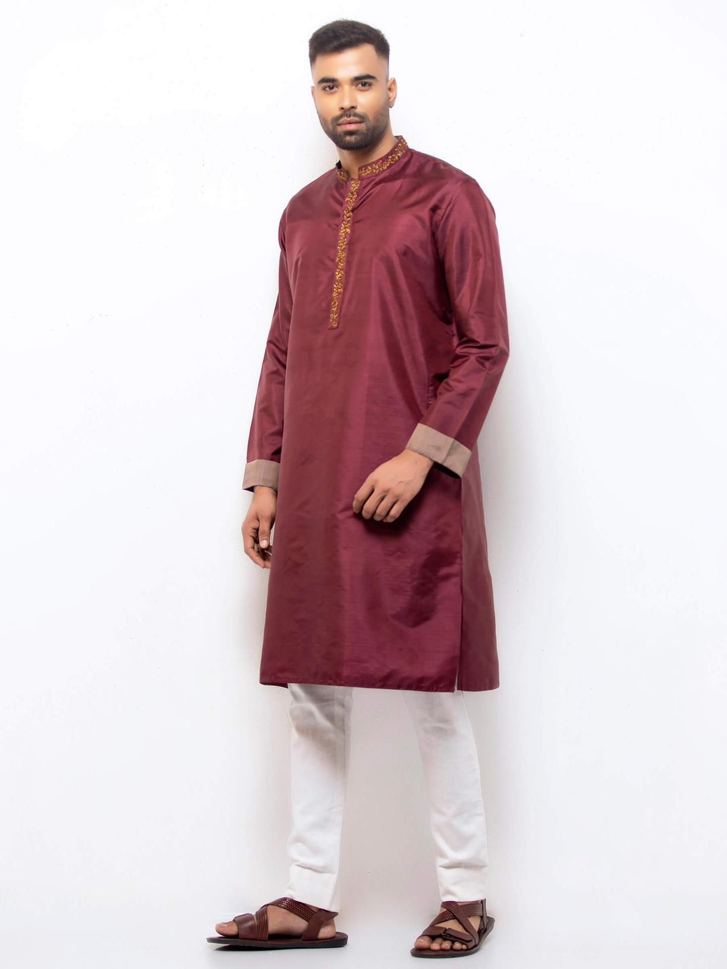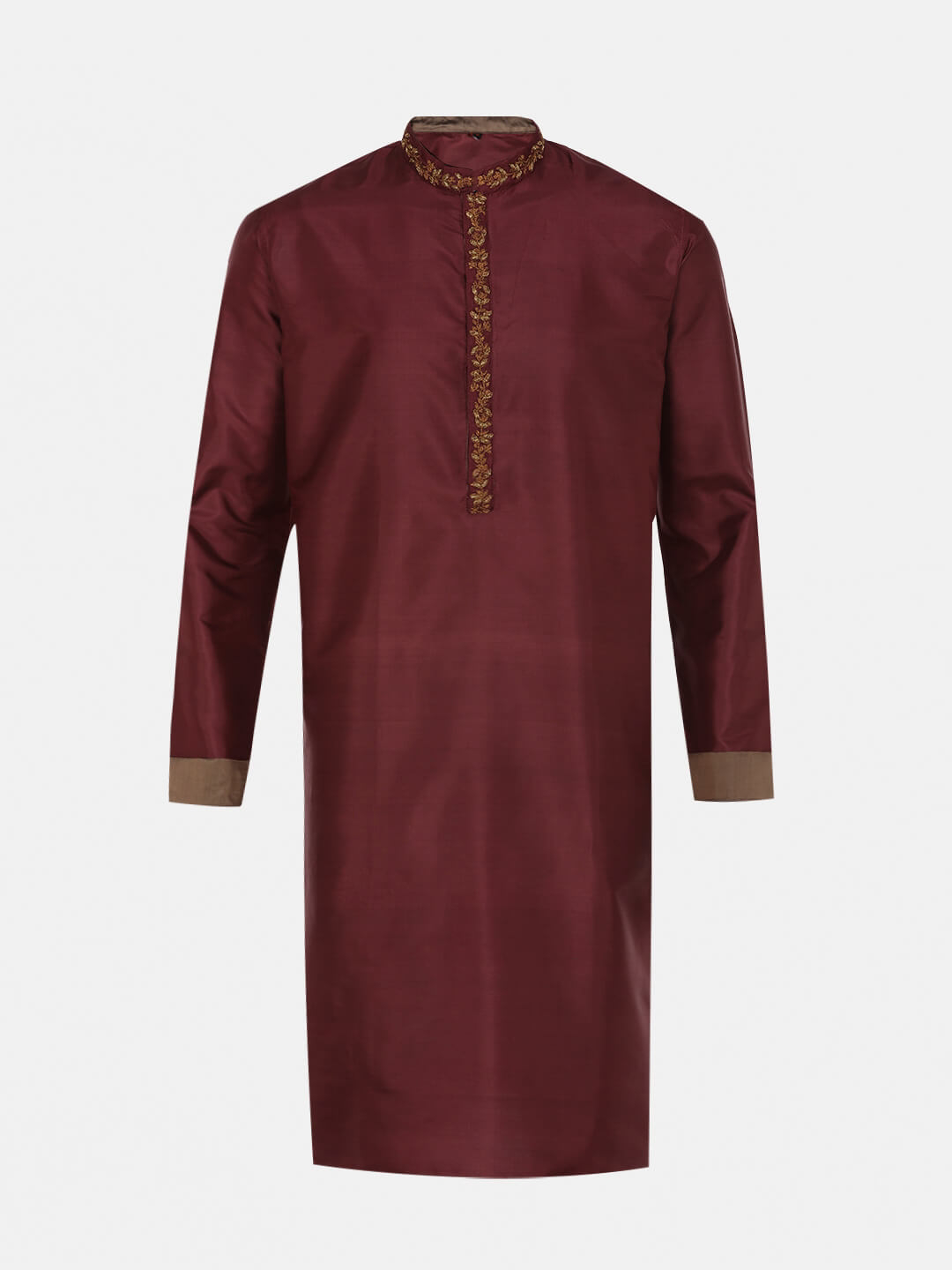 Maroon silk panjabi with erri embroidery and trimmed sleeves.