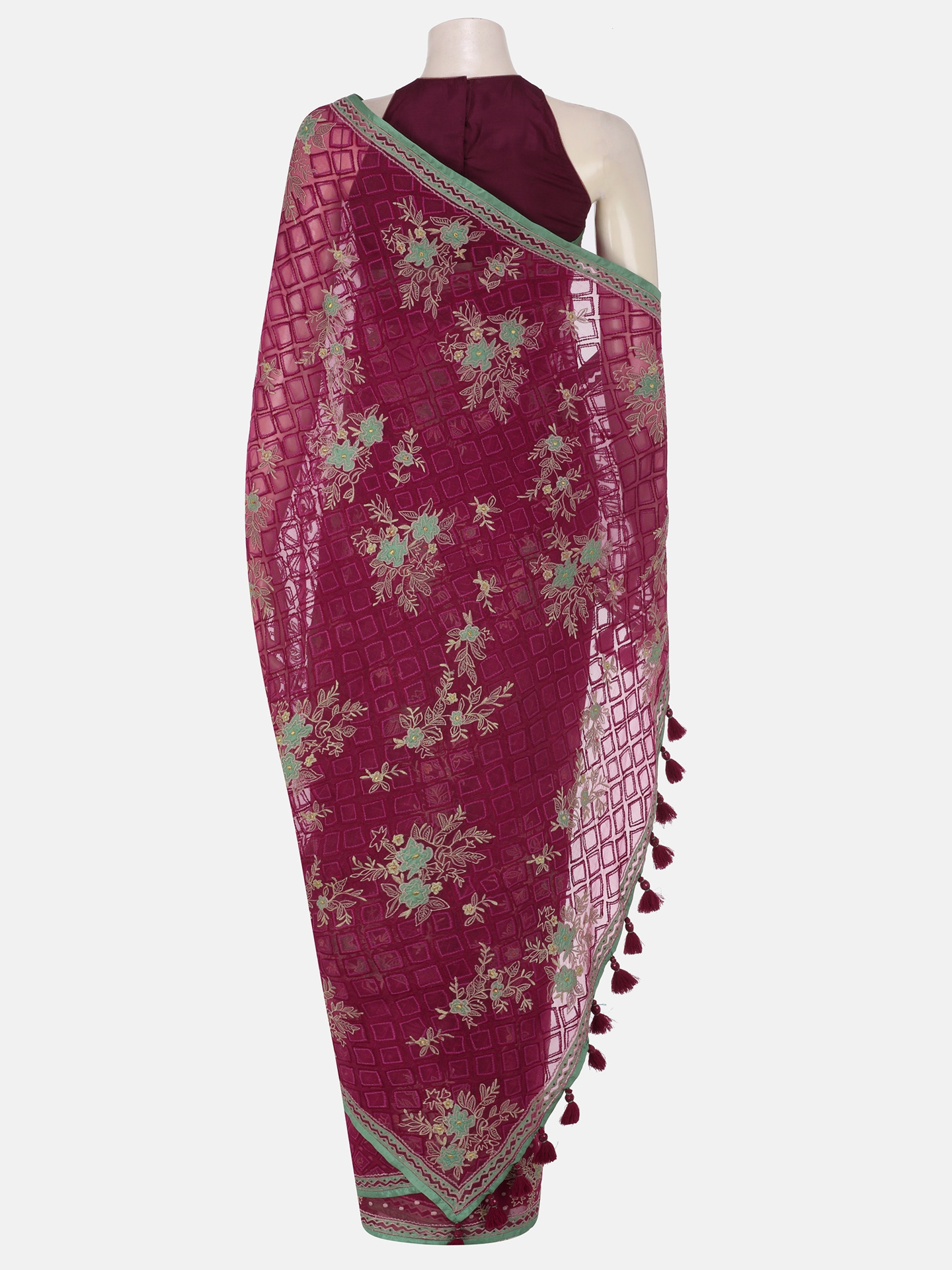 Maroon muslin saree with maroon, fuchsia, sage green and golden floral embroidery and pastel green applique. Comes with tassel trimmed aanchal and unstitched blouse piece.