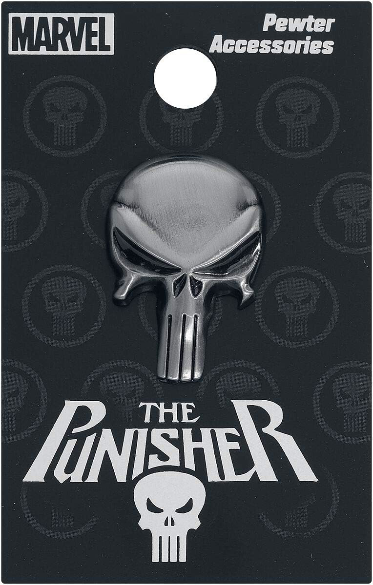This striking lapel pin showcases the emblematic skull logo associated with the enigmatic vigilante known as The Punisher. Crafted from premium pewter, it exudes a sense of rugged durability and uncompromising resolve, mirroring the character it represents. Whether you're a fan of the comics, the Netflix series, or simply appreciate the anti-hero's unwavering quest for justice, this lapel pin is a bold statement piece that adds a touch of gritty sophistication to any ensemble. Officially licensed by Marvel Comics, it's a must-have accessory for Punisher fans and collectors alike.