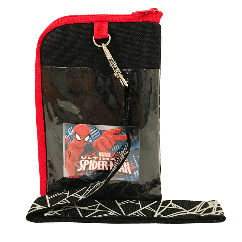 This Marvel Spiderman cellphone case features the iconic superhero. It includes a detachable lanyard for convenient carrying and a transparent pocket for holding an ID card. Crafted from durable fabric, this case ensures your phone and small items are securely stored.