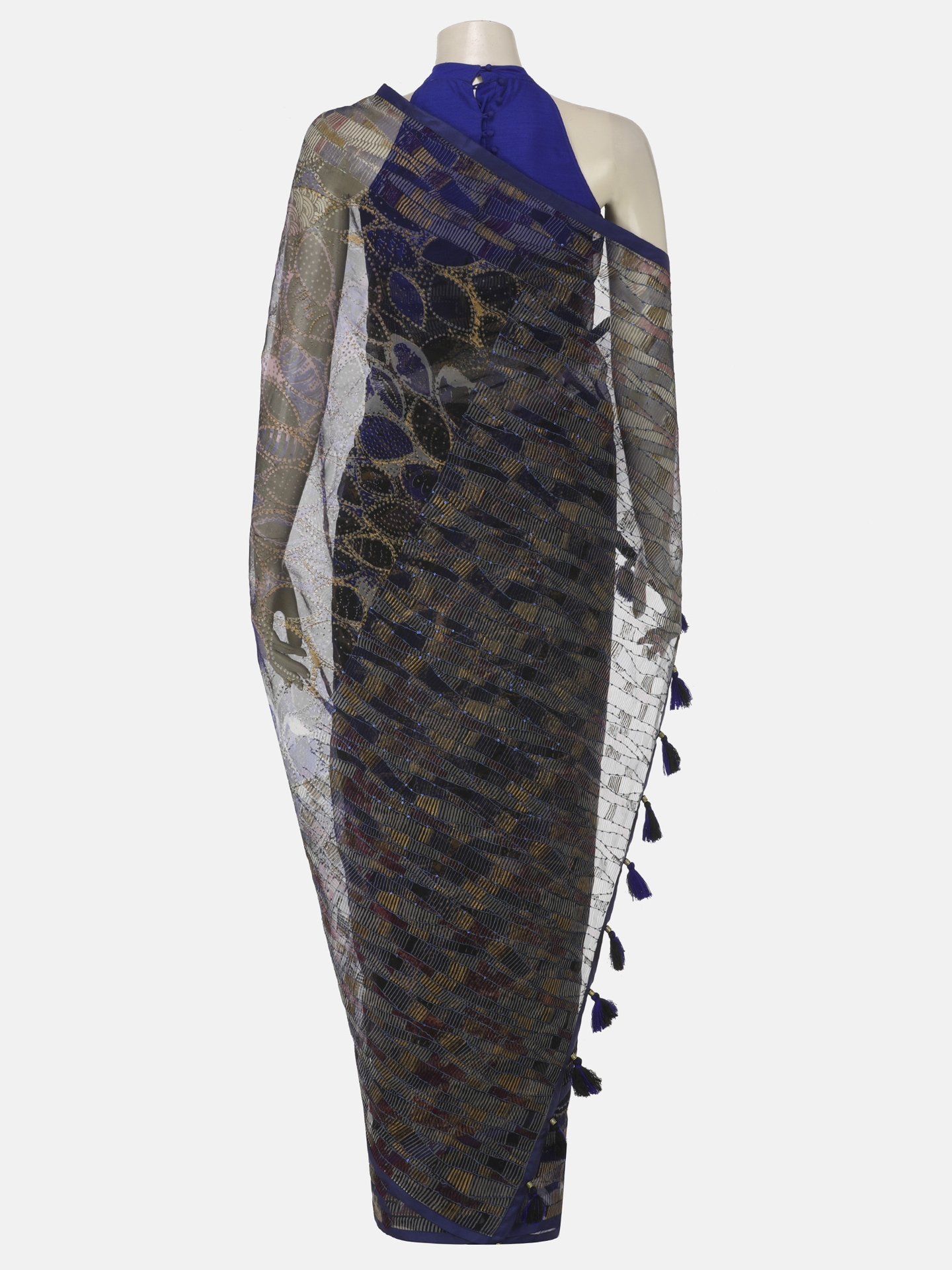 Mauve dyed muslin saree with multicolour prints. Comes with unstitched deep blue blouse piece.
