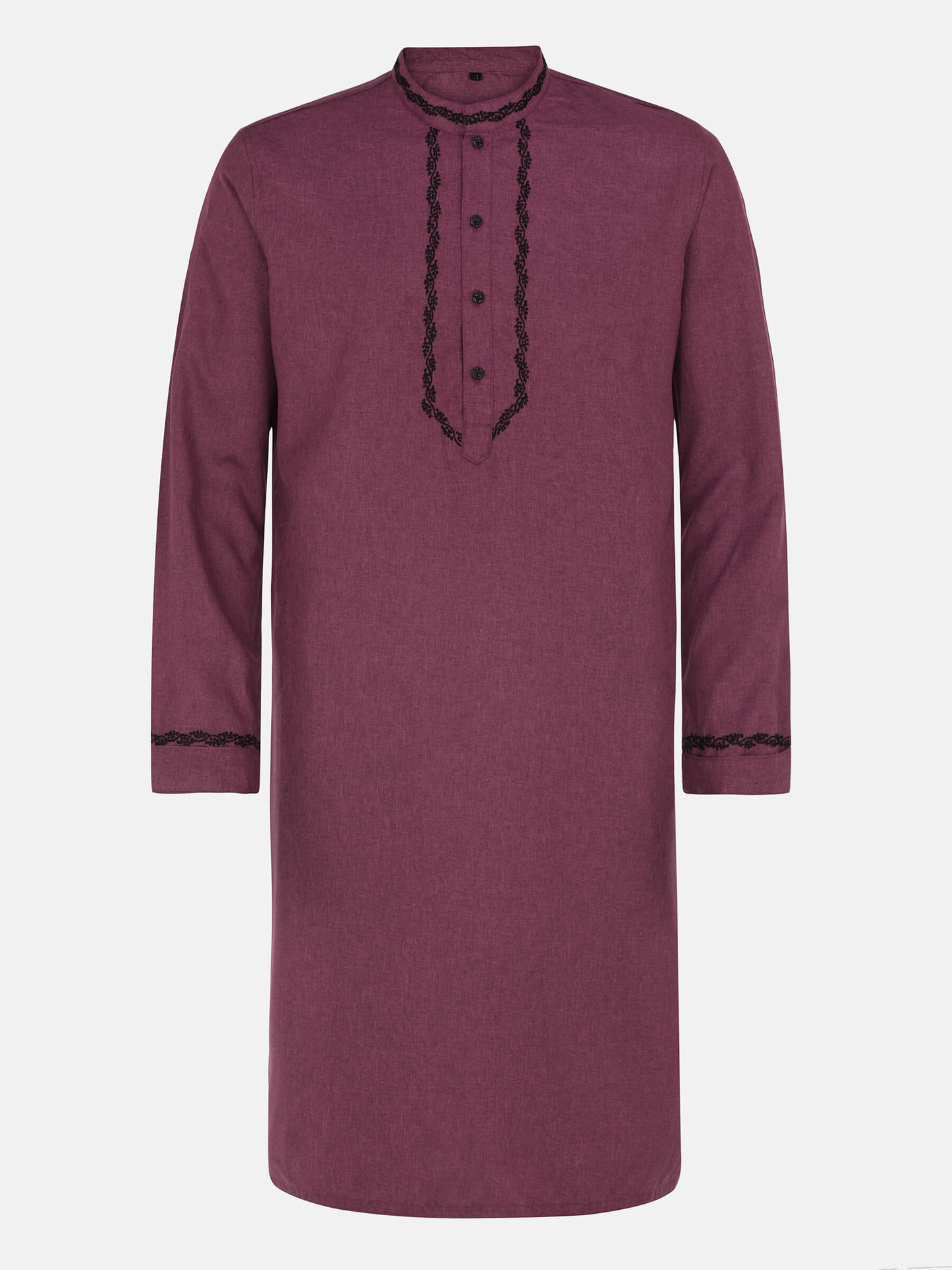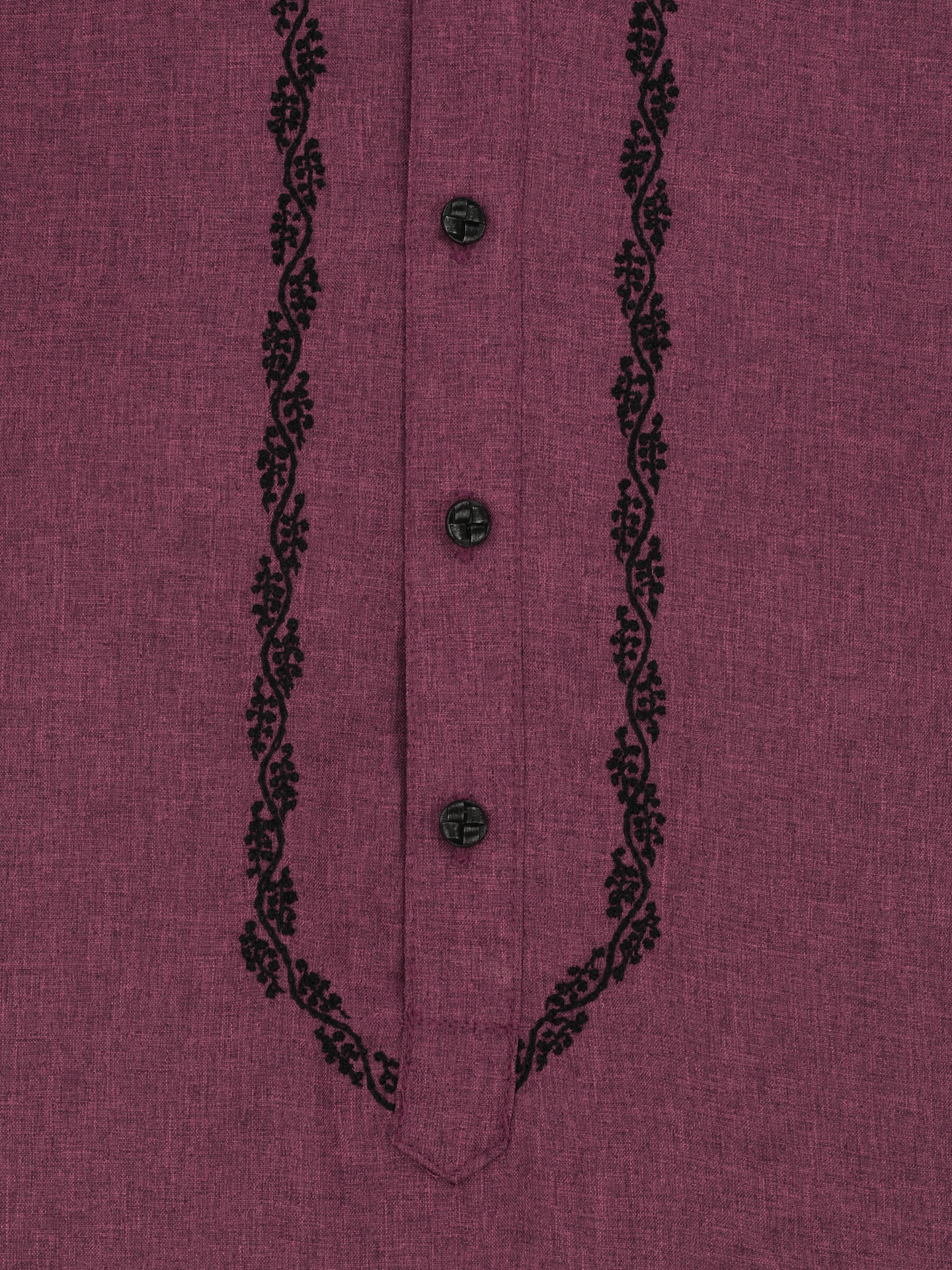 Mauve cotton panjabi with black embroidery. Comes with black cotton pajama with drawstring, button fly and elastic waist.