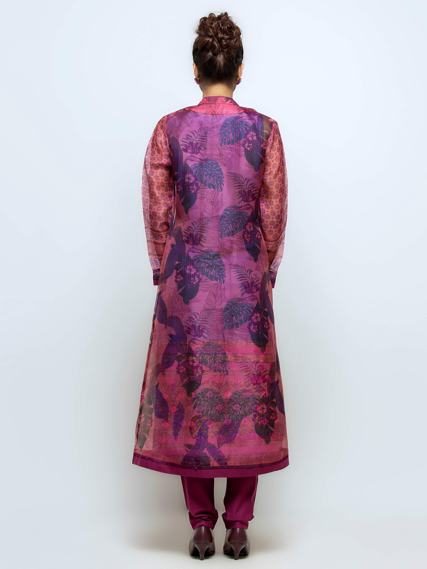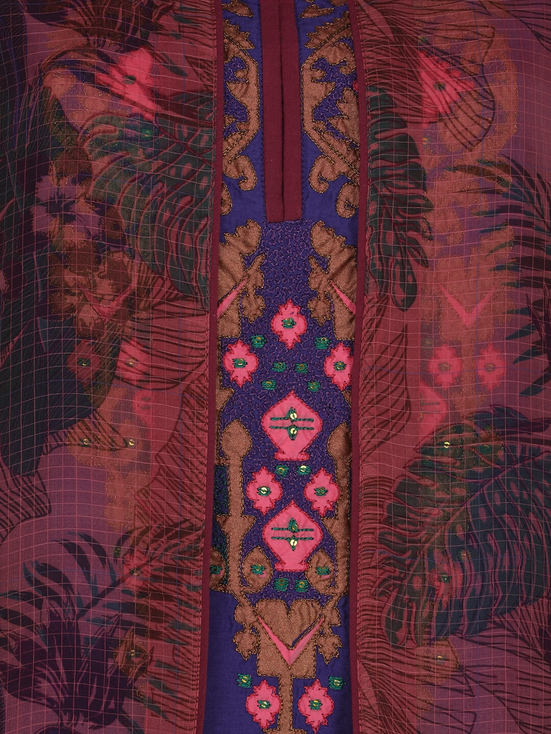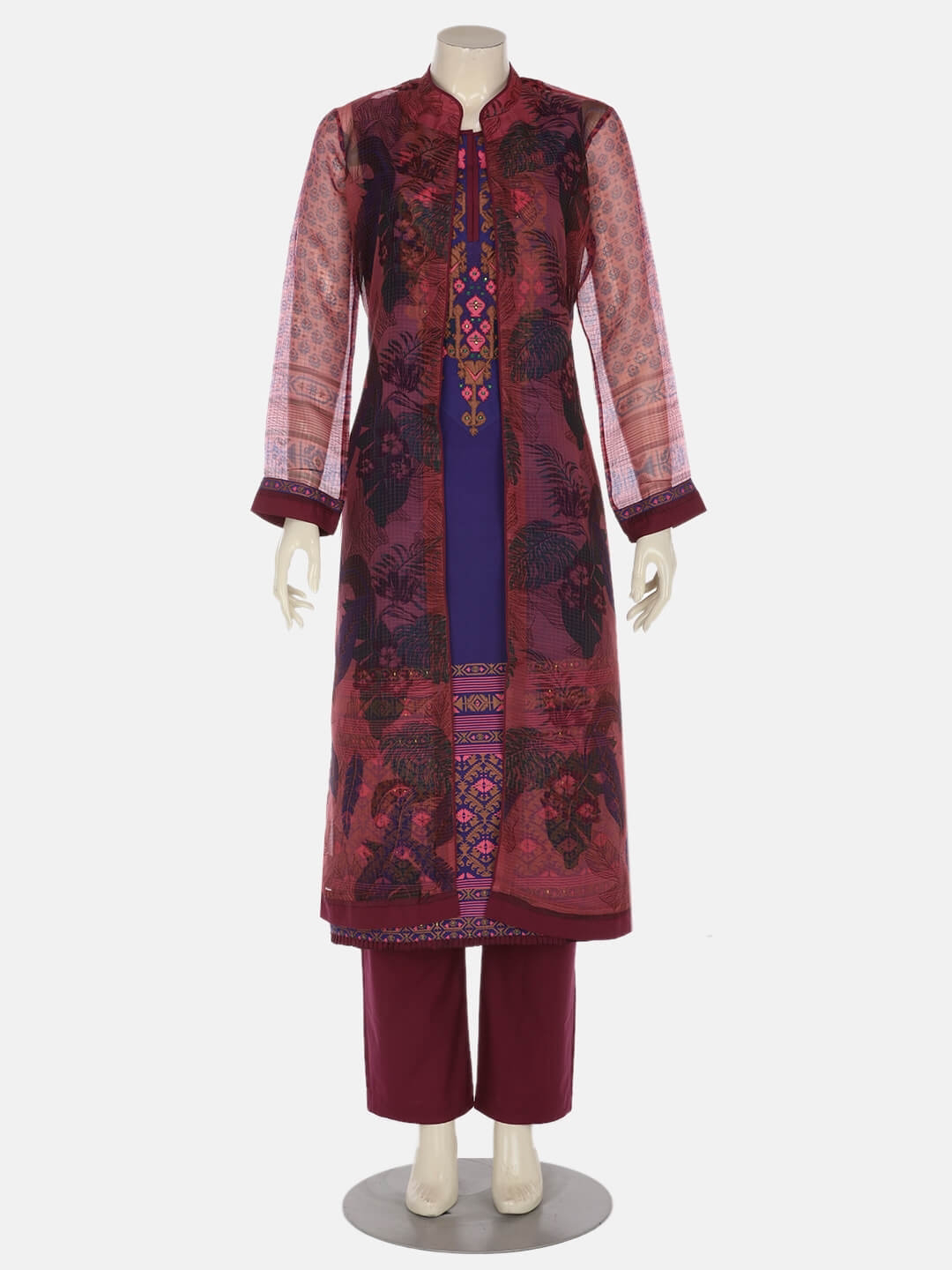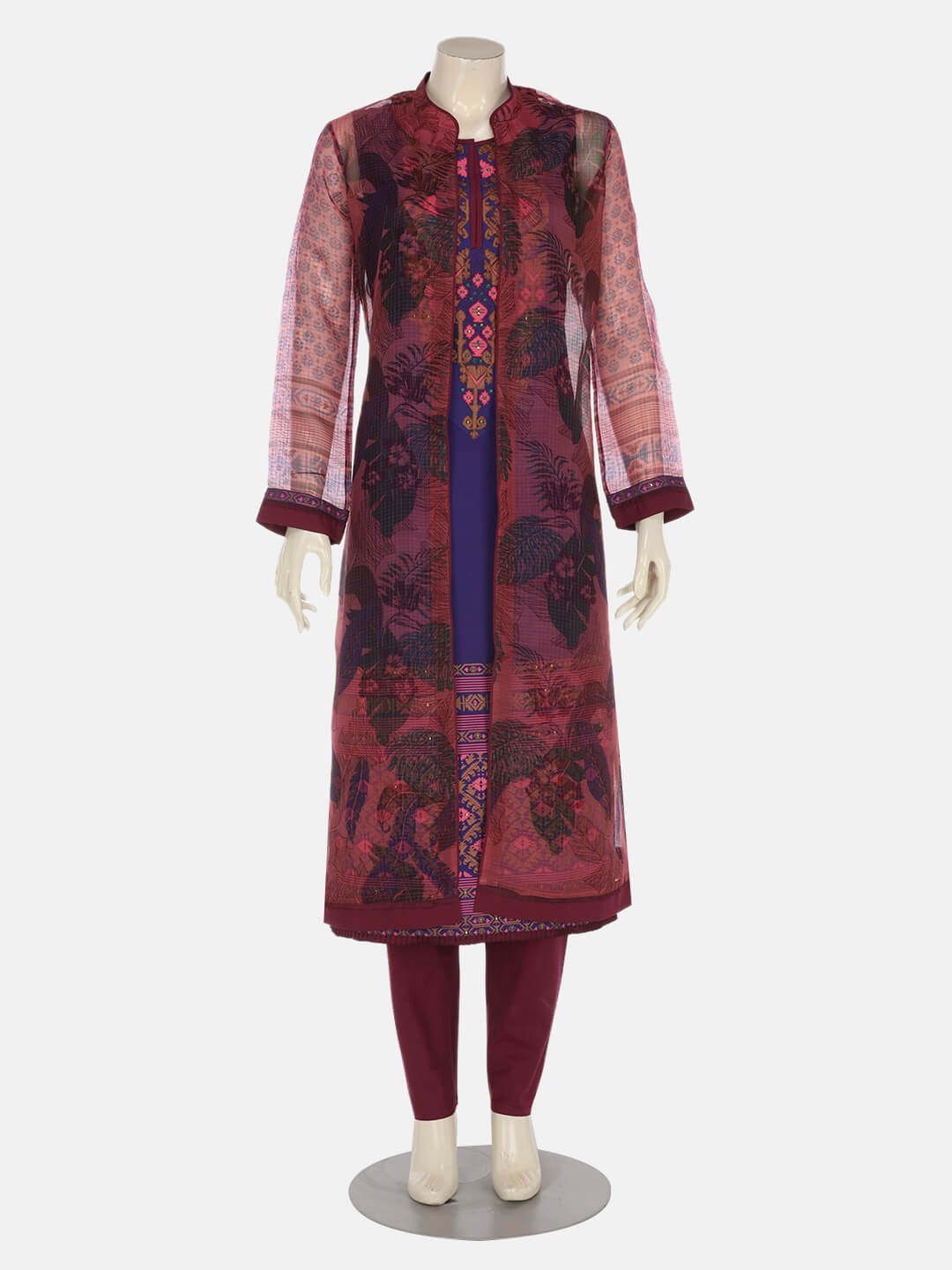 Blue joysree silk kameez with golden, purple and pink embroidery. Comes with plum cotton shalwar. A mauve printed muslin-cotton coaty comes in this set.
