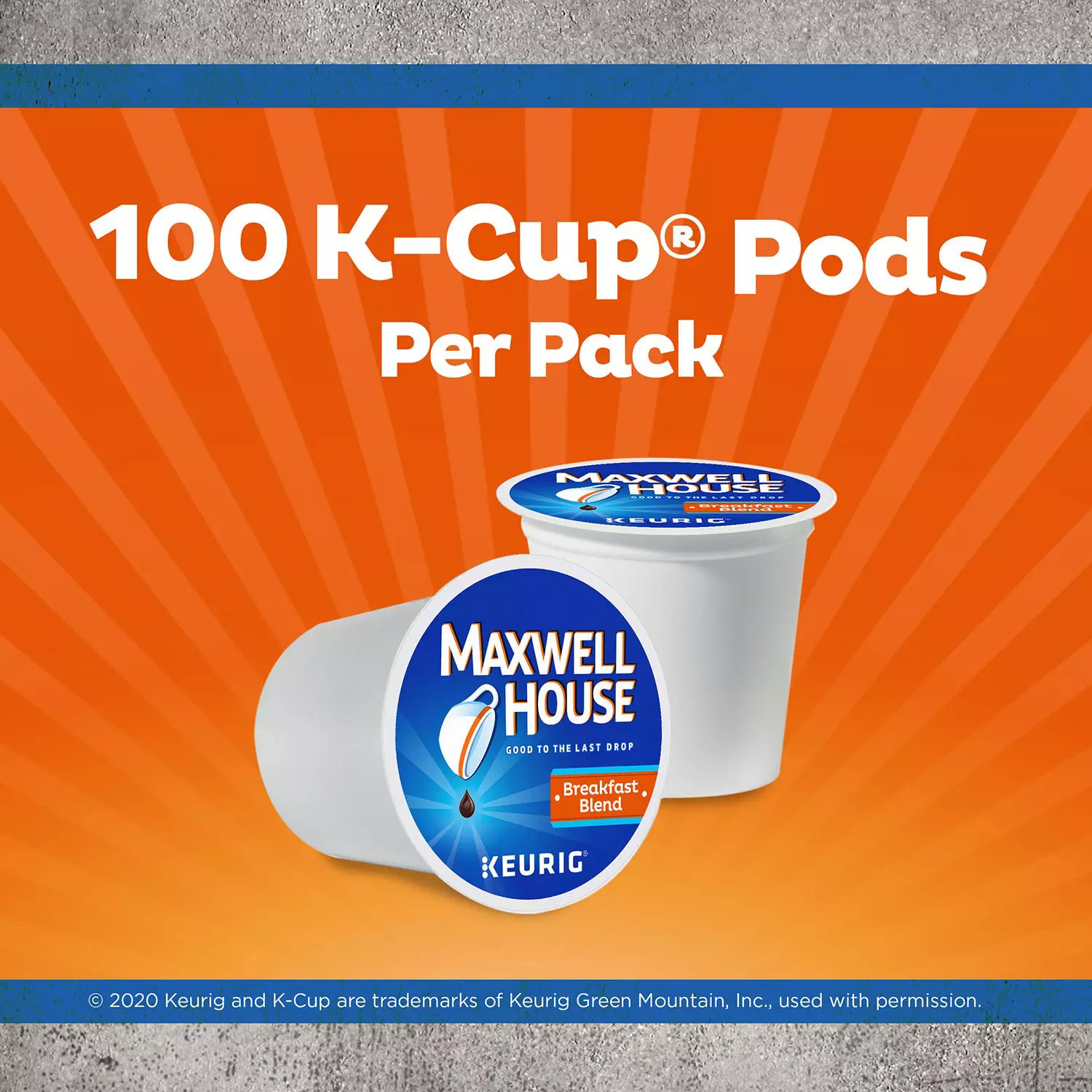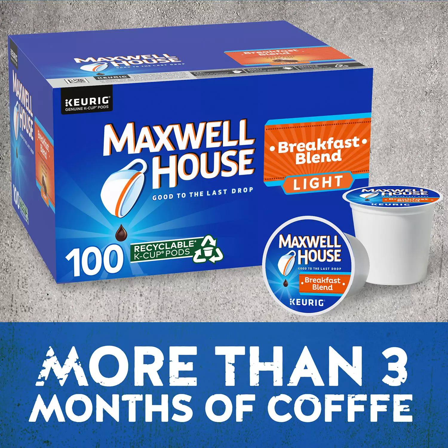 Maxwell House Light Roast Breakfast Blend Coffee K-Cup Pods have a consistent signature taste that is good to the last drop. Our balanced light roast coffee is exceptionally smooth and is the perfect start to your day. Maxwell House K-Cups are made with 100% pure coffee. Every breakfast blend coffee is great served black or with cream and sugar. Brew a single cup of this balanced light roasted breakfast blend coffee in any Keurig brewing system for a bright, lively cup of coffee anytime you want. Maxwell House Breakfast Blend Coffee is packaged in a 100-count box of individual K-Cups for single-serve use every morning. Our signature taste is created through a process that isn't done the easy way, but the right way, for 125 years. Good to the last drop. Keurig, K-Cup, K Cup, and the K logo are trademarks of Keurig Green Mountain, Inc., used with permission. For use with Keurig K-Cup Brewers.