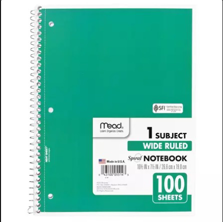 Spiral Bound Notebook, Wide/Margin Rule, 8x10-1/2, White,1 Subject 100 Sheets/Pad