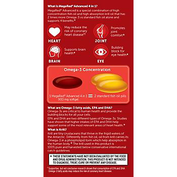 MegaRed Advanced is a special combination of high-concentration fish oil and high absorption krill oil that has 2 times more Omega-3s than standard fish oil alone and supports 4 benefits. MegaRed Advanced 4-in-1 may reduce the risk of coronary heart disease, promotes joint comfort, supports brand health, and is a building block for eye health.