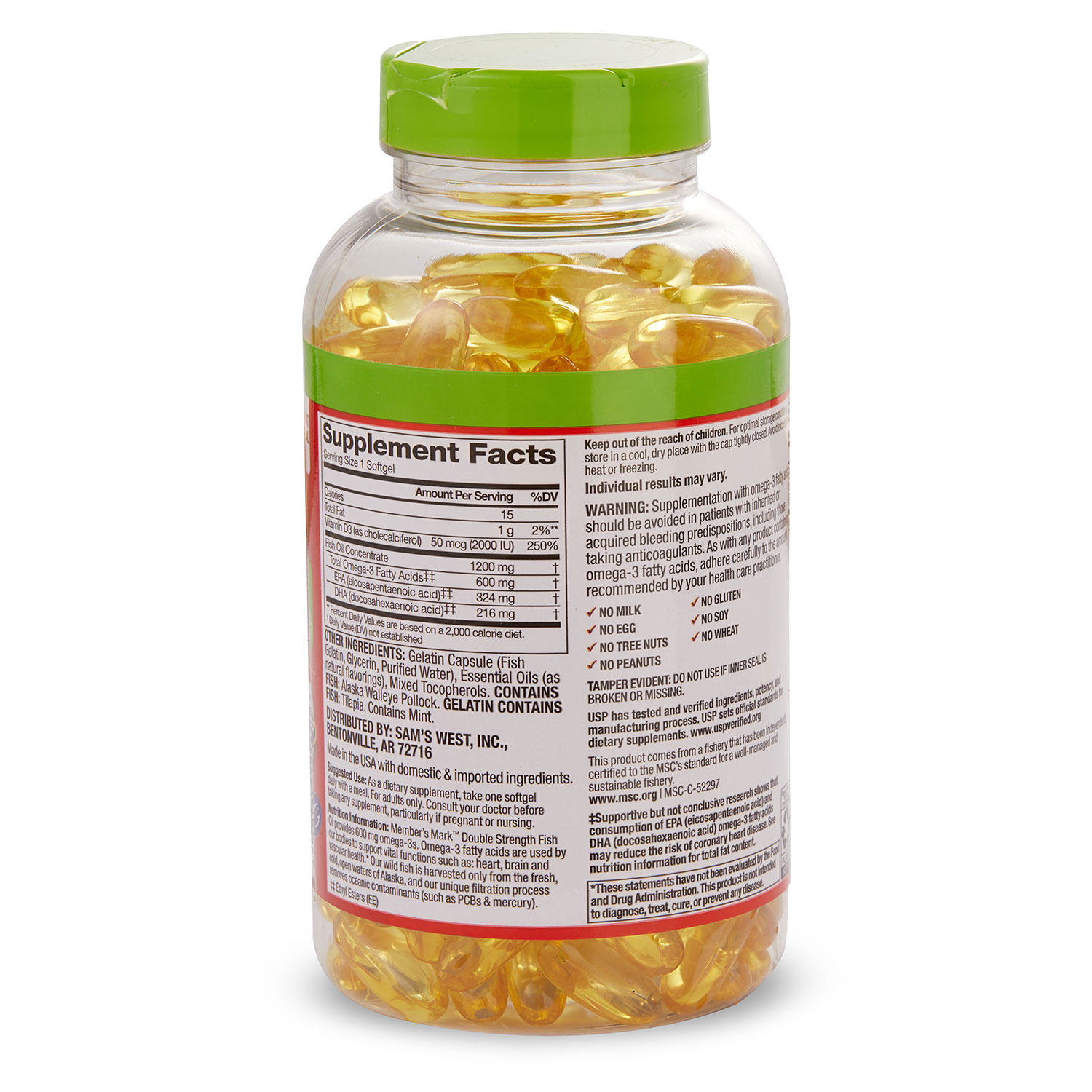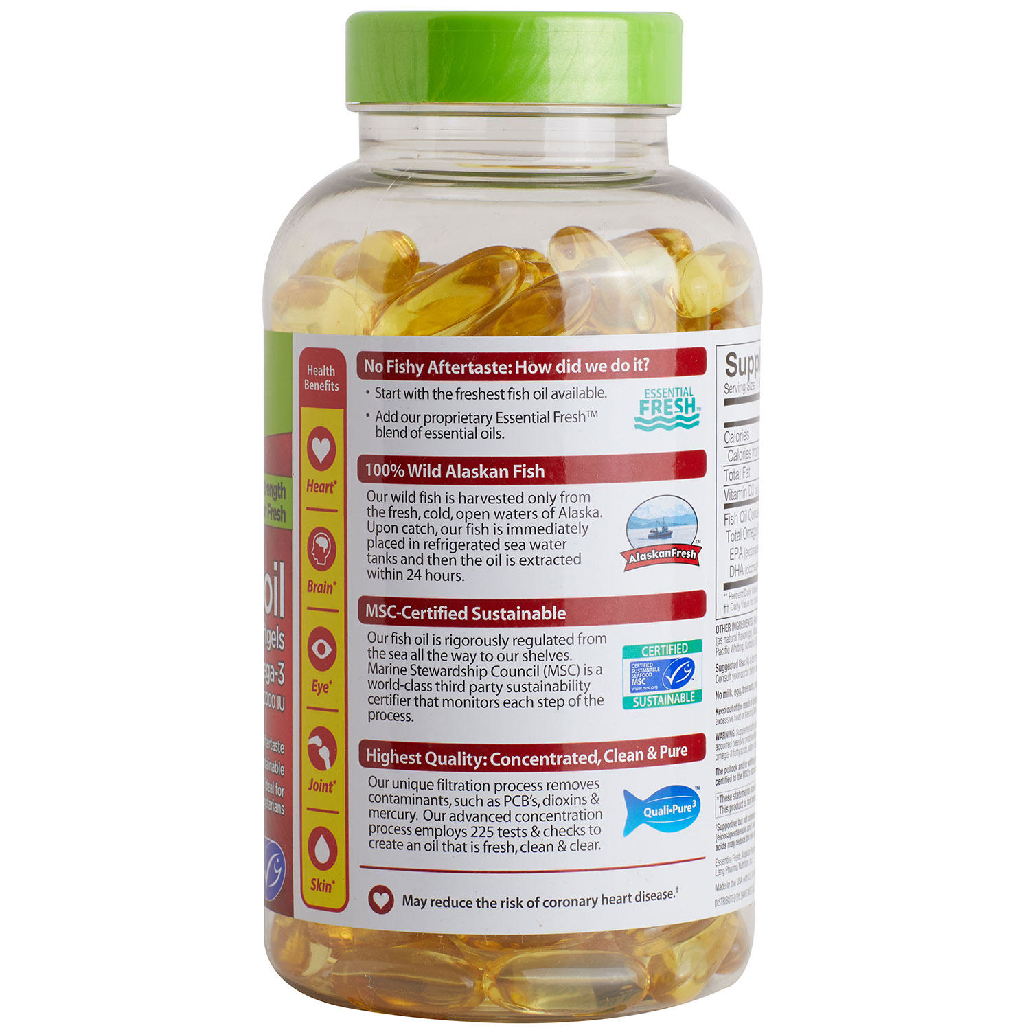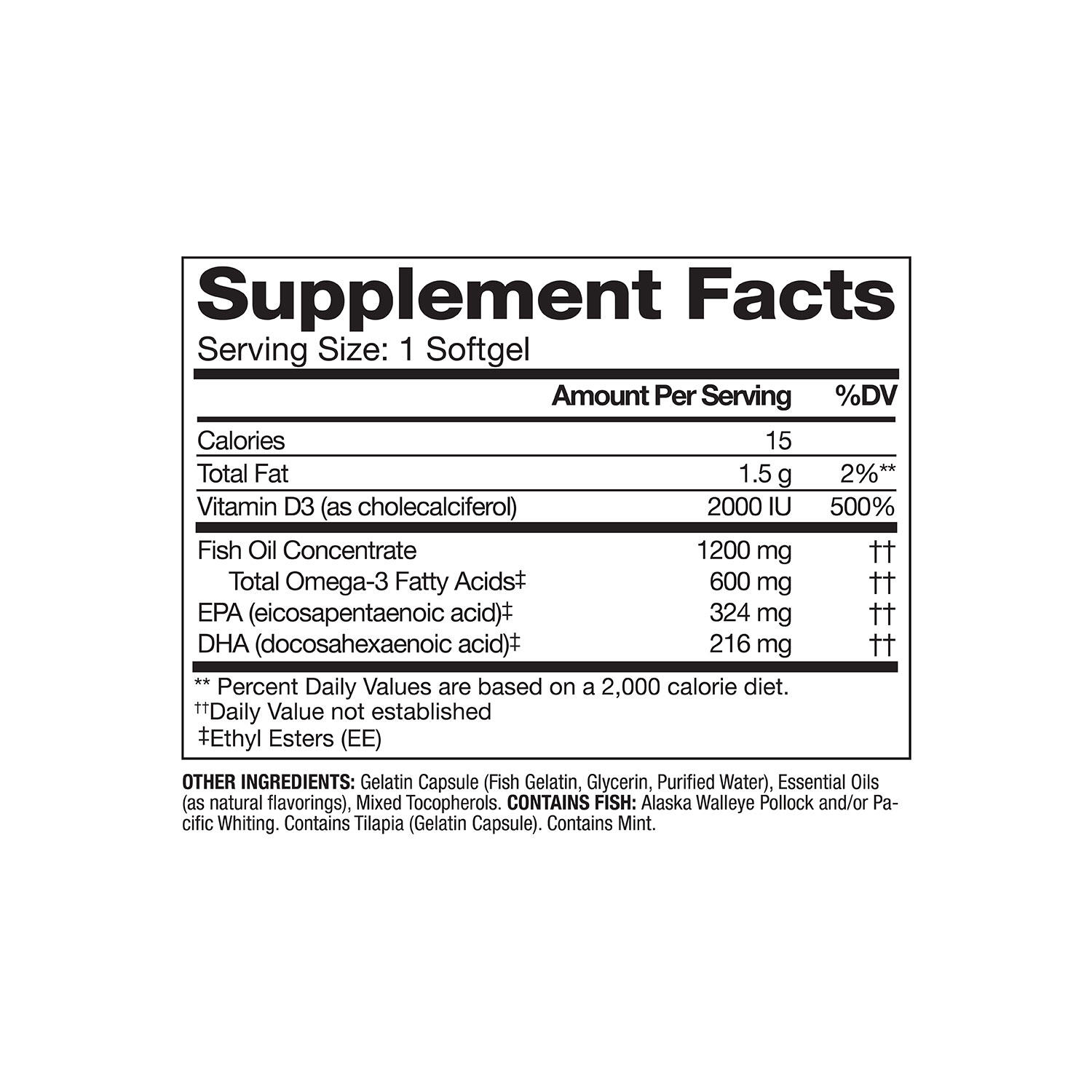 Member's Mark Double Strength Omega-3† is a must-have for your family's cabinet. Here's why:No Fishy Aftertaste: How did we do it?Start with the freshest fish oil† available. Add our proprietary Essential Fresh™ blend of essential oils100% Wild Alaskan FishOur wild fish is harvested only from the fresh, cold, open waters of Alaska. Upon catch, our fish is immediately placed in refrigerated sea water tanks and then the oil is extracted within 24 hours.MSC-Certified SustainableOur fish oil† is rigorously regulated form the sea all the way to our shelves. Marine Stewardship Council (MSC) is a world-class third party sustainability certified that monitors each step of the process.Highest Quality: Concentrated, Clean & PureOur unique filtration process removes contaminants, such as PCB’s, dioxins & mercury. Our advanced concentration process employs 225 tests & checks to create an oil that is fresh, clean & clear.*These statements have not been evaluated by the Food and Drug Administration. This product is not intended to diagnose, treat, cure or prevent any disease.