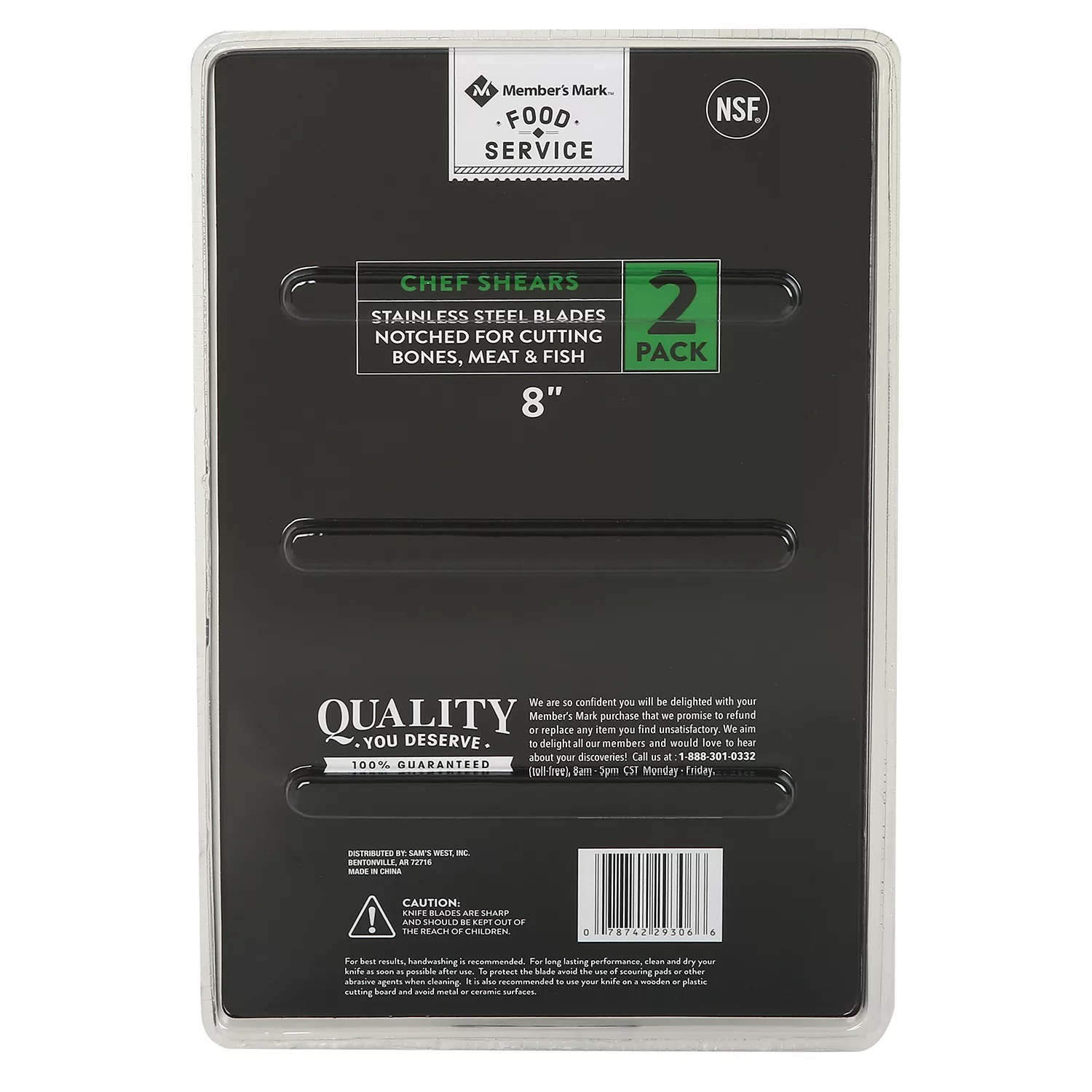 With Member's Mark 8" Chef Shears (2pk.), you have a multi-purpose tool you can find good use for in the kitchen. Sharp and used as a scissor, you can easily shred through food and packages like you would with paper. The stainless steel blades provide superior performance and long-lasting durability. Keep one nearby and you'll use it more than your knives.
