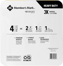 The Member's Mark Heavy Duty Scissor and Box Cutter Set include a utility knife containing a re-loadable cartridge for holding up to ten blades. Five double-edged blades included. Ergonomic Rubber Grip helps reduce fatigue. Ideal for heavy usage cutting of plastic packages, thick fabric, and boxes. The Member's Mark Titanium Bonded Scissors are three times harder than untreated stainless steel blades. Westcott uses a process that bonds titanium to a stainless core to produce a sharper, more durable, and longer-lasting cutting edge. These scissors will stay sharp and smooth-cutting for years, making them an exceptional value like all Westcott products. they stay sharp and effective even after long use. The redesigned ergonomic handle provides maximum comfort during use. These will be the last scissors you will ever need.