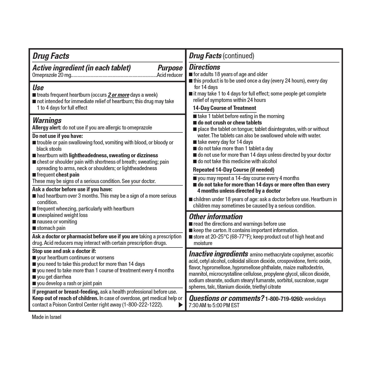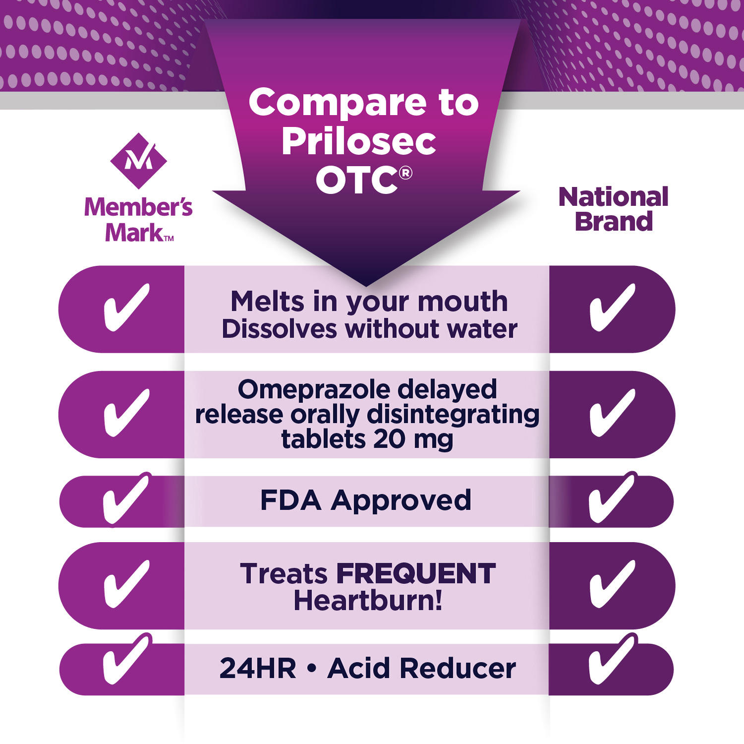 Member's Mark Omeprazole Delayed-Release Orally Disintegrating Tablets treats the same frequent heartburn symptoms as Member's Mark Omeprazole or Prilosec OTC©. This product melts in your mouth and dissolves without water. Taken once every 24 hours for 14 days, this tablet treats frequent heartburn that occurs two or more days a week. Not intended for immediate relief of heartburn; may take 1 to 4 days for full effect.