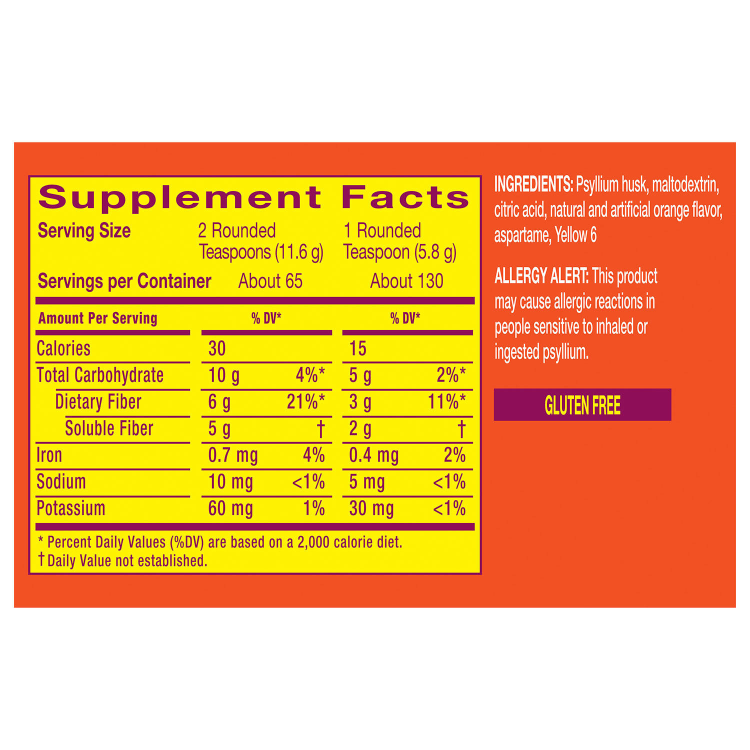 Psyllium Husk, Maltodextrin, Citric Acid, Natural and Artificial Orange Flavor, Aspartame, Yellow 6