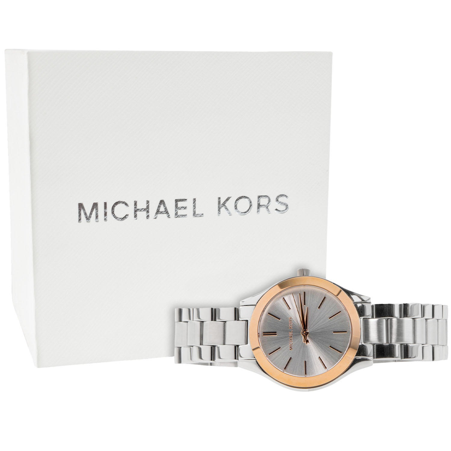 The Mini Slim Runway Watch by Michael Kors is a sleek addition to your watch collection. The two-tone details will add a pop of color to any outfit.