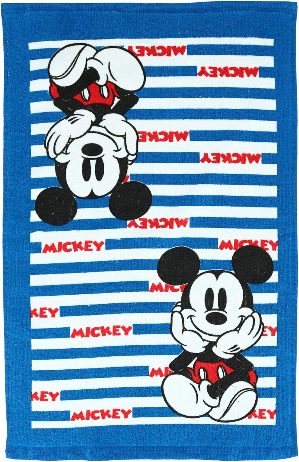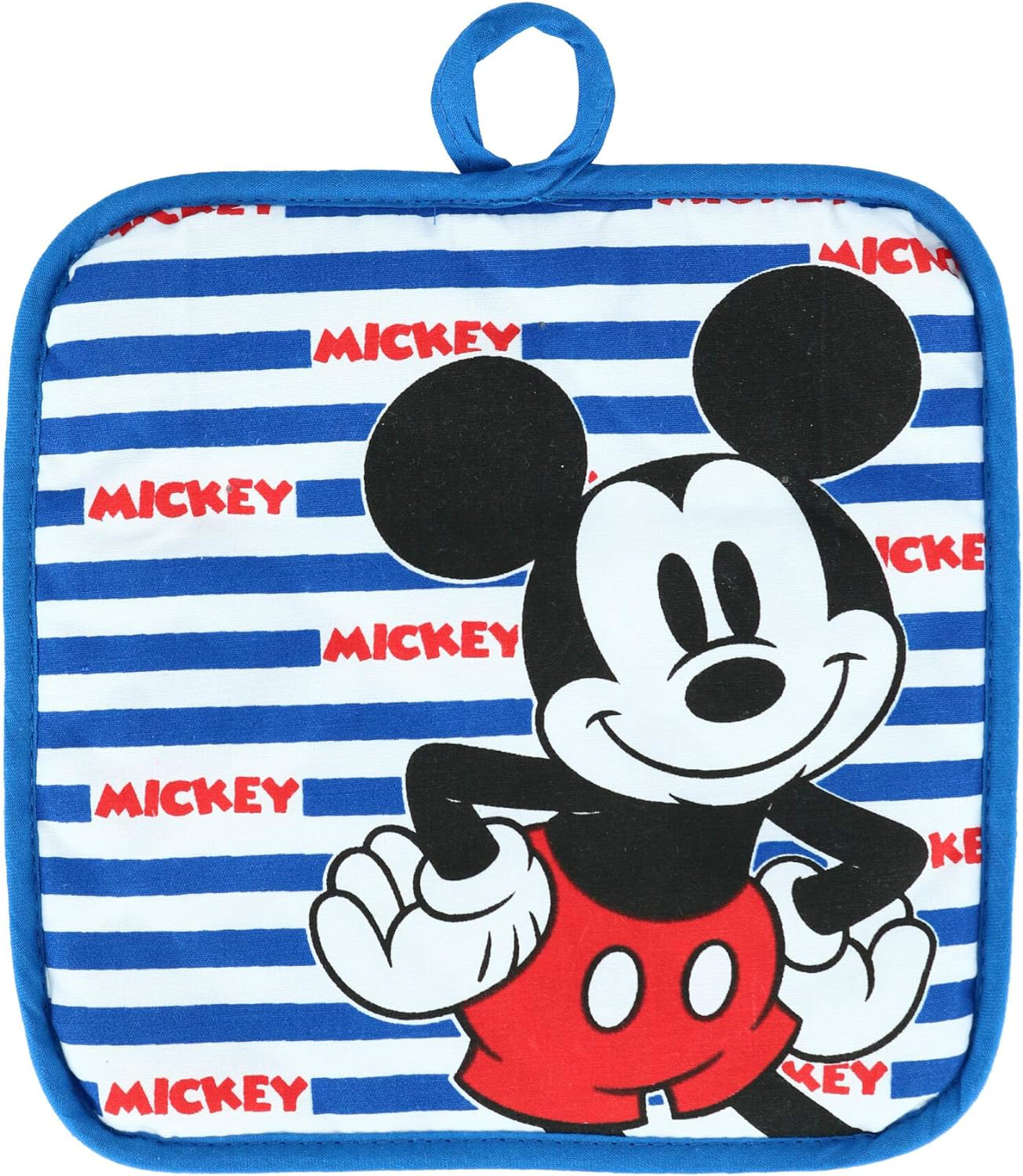 Features Mickey Mouse on blue, white and red "Mickey" stripes pot holder, standing Mickey Mouse on blue, white and red "Mickey" stripes oven mitt, and Mickey Mouse sitting with hands on chin on blue, white and red "Mickey" stripes dish towel.