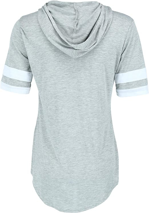 This Mickey Mouse hooded football top is great to wear year-round. It is lightweight and comfortable for all day wear and also has short sleeves to keep you cool. The cute Mickey Mouse print and striped sleeves make this top stand out. The hood has a functional drawstring and this top is soft to the touch..