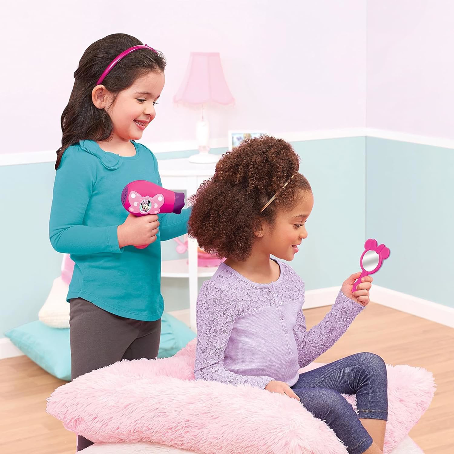 includes a battery operated hair dryer toy with realistic sounds, play curling Iron, comb, minnie Hairbrush, Hair Bows, mirror, play lipstick ,2 hair barrettes & 2 Hair Clips, mirror, play lipstick & 2 hair barrettes to set your style perfectly! a beautiful, reusable vinyl tote helps store your minnie beauty set when not in use.Your minnie mouse bowtastic fan will love using our minnie brush and comb set plus minnie mouse blow dryer to dry her clients hair. Watch your child's imagination come to life with our deluxe minnie mouse hairstyling set. Don't worry we've included everything she needs to keep stylin for endless hours of pretend play as minnie mouse in her very own minnie mouse store bow-tastic boutique.Glam it up with this Minnie Mouse Hair Set, includes an assortment of fun hair accessories for your little one to use in her salon and for mommy to doll her up too! Also included is a minnie hair brush and comb set, plus a bag to store her favorite hair goodies. She'll have a blast dressing up her and her friends as her favorite mouse!Take your styling tools on the go using the included storage bag. You never know when you'll need to touch up your lipstick or check your do with the included minnie mouse toy mirror. you won't want to ever leave home without your minnie bowriffic hairstyling set.