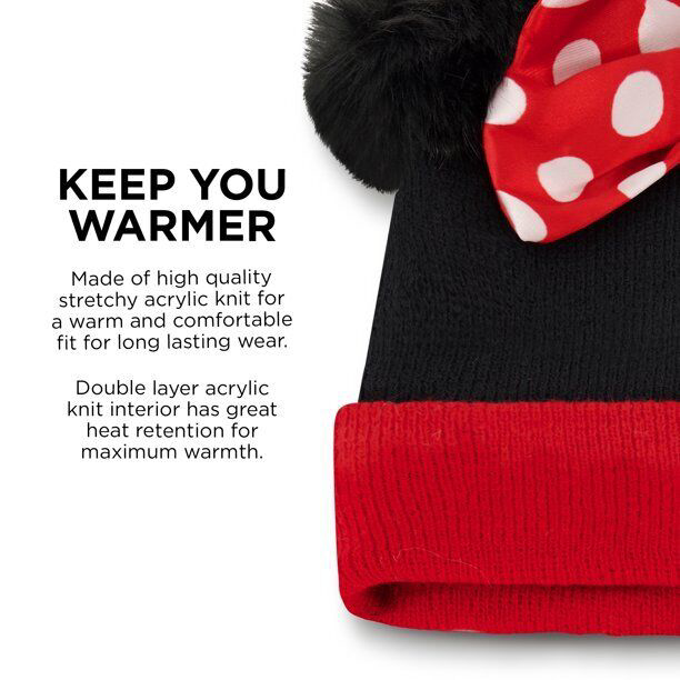 Show your love for Disney’s Minnie Mouse with the sweetest new cozy beanie! This black and red color blocked double pom Minnie Mouse beanie is ultra-cozy, warm and cute and features two black faux fur poms, plus a plush red polka dot Love Pom on top. It’s the happiest hat on earth!