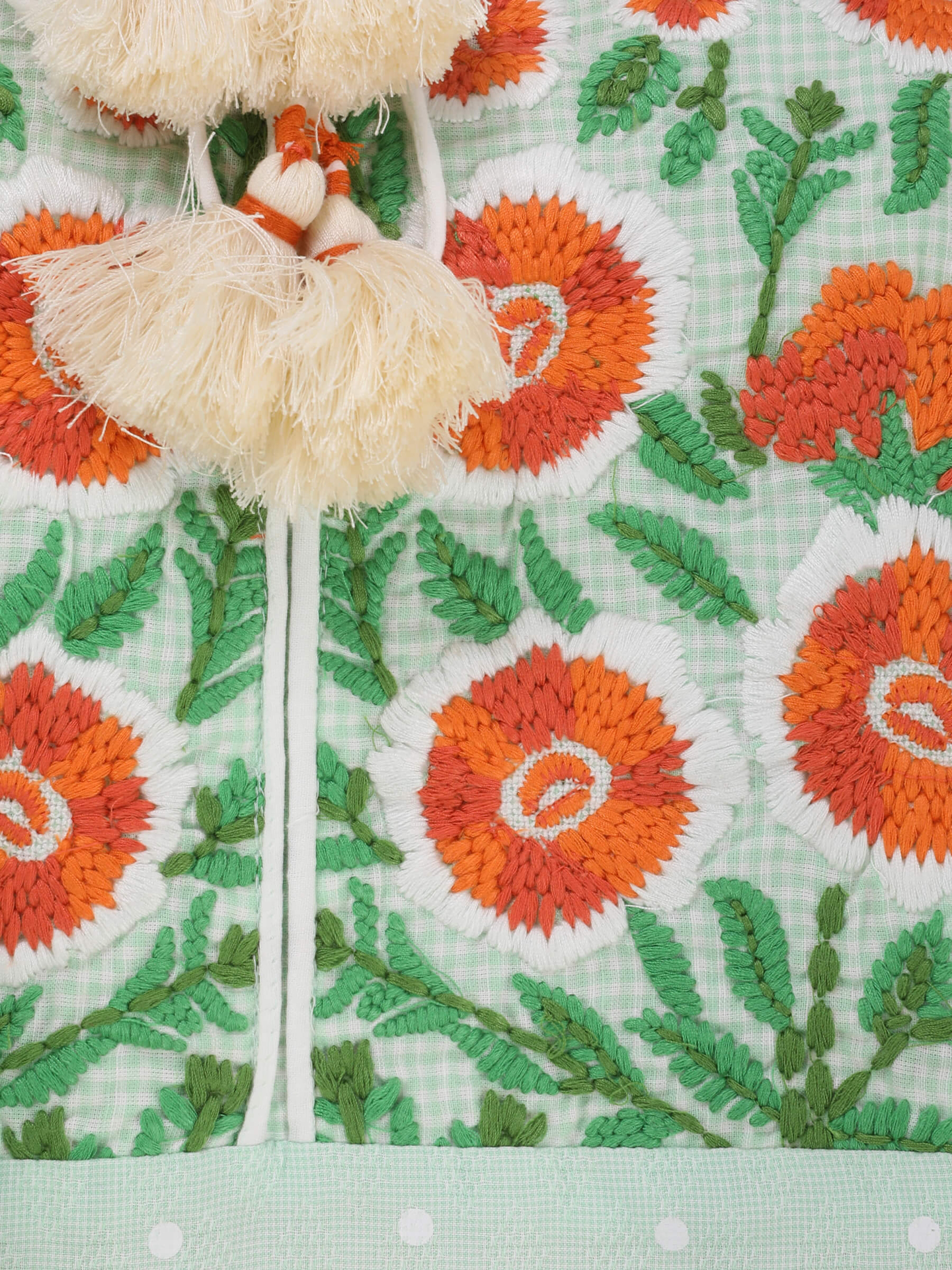 Mint green printed viscose-cotton kameez with multicolour embroidery. Comes with mint green viscose-cotton shalwar and printed dobby textured mint green viscose-cotton dupatta.