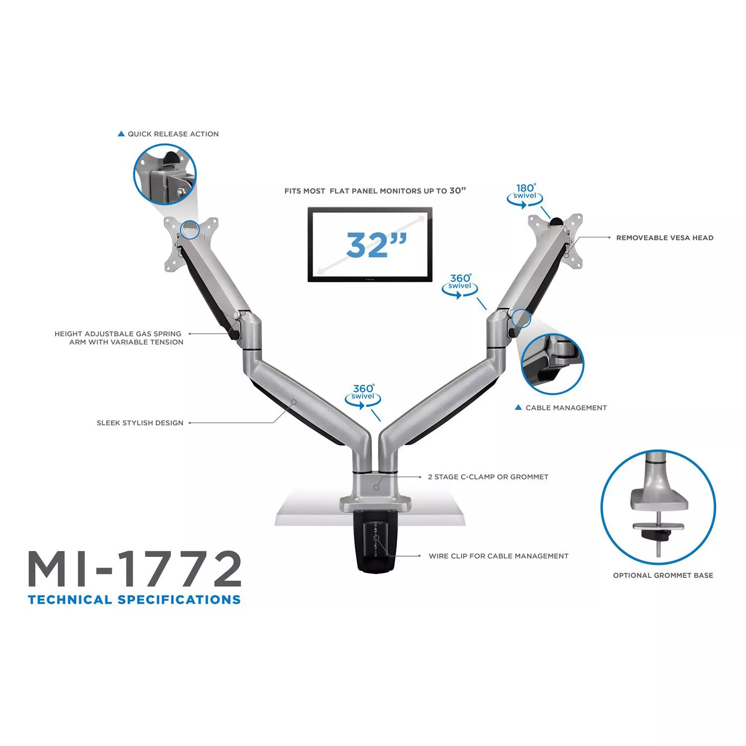 Constructed of aluminum and steel components to support 2 monitors up to 20 lbs.