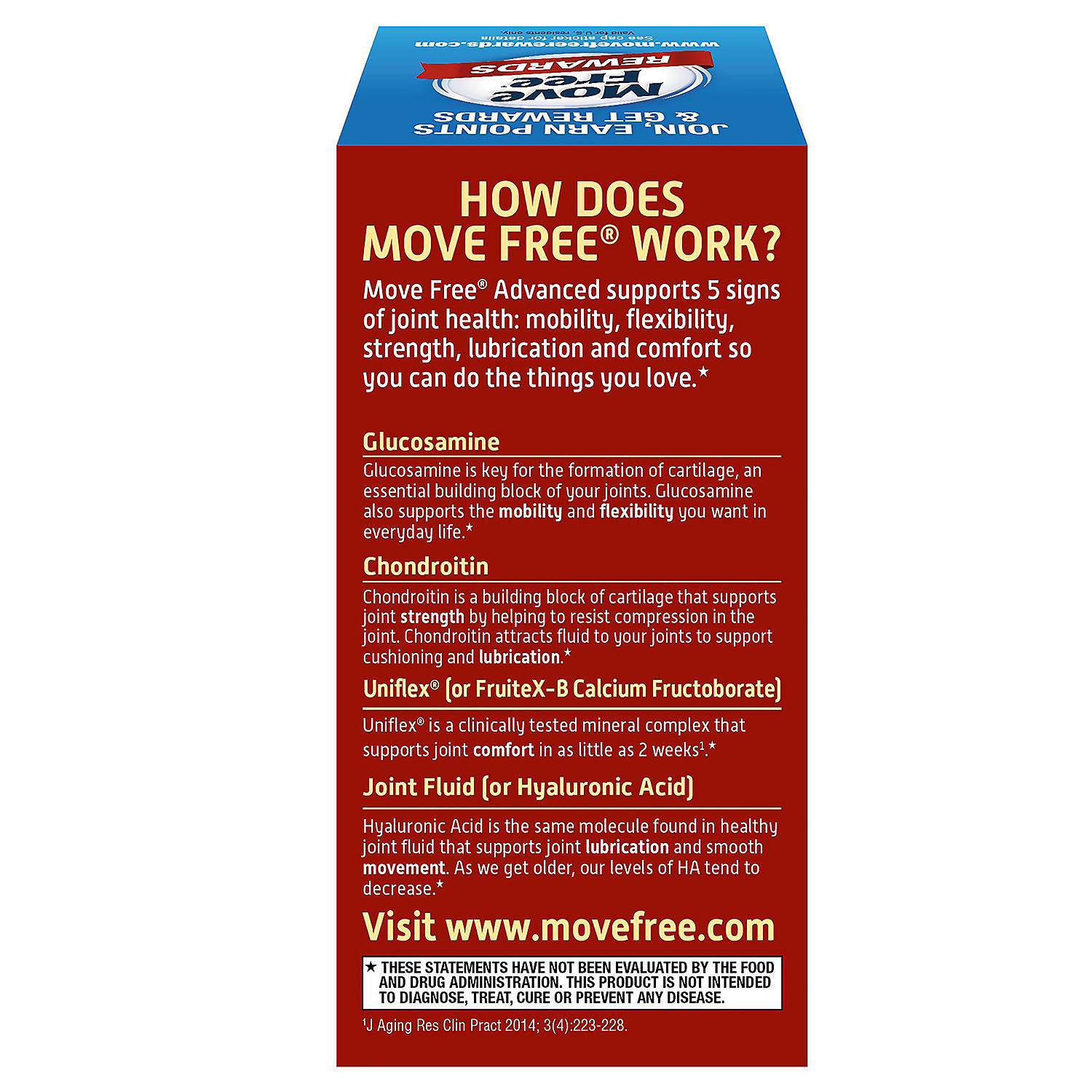 Move Free Advanced supports 5 signs of joint health: mobility, flexibility, strength, lubrication and comfort so you can do the things you love†. It does so by providing you with ingredients: Glucosamine, Chondroitin, Uniflex, and Hyaluronic Acid (HA).