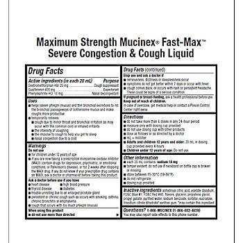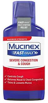 Mucinex Fast-Max Severe Congestion & Cough helps relieve severe congestion and cough symptoms with a liquid that combines the mucus busting power of Mucinex and maximum strength medicines.* It's a whole new day for relief in a brand new liquid from Mucinex. Mucinex Fast-Max Severe Congestion & Cough contains Dextromethorphan HBr cough suppressant, Guaifenesin expectorant and Phenylephrine HCl nasal decongestant. Use it to control cough, relieve nasal and chest congestion and thin and loosen mucus.