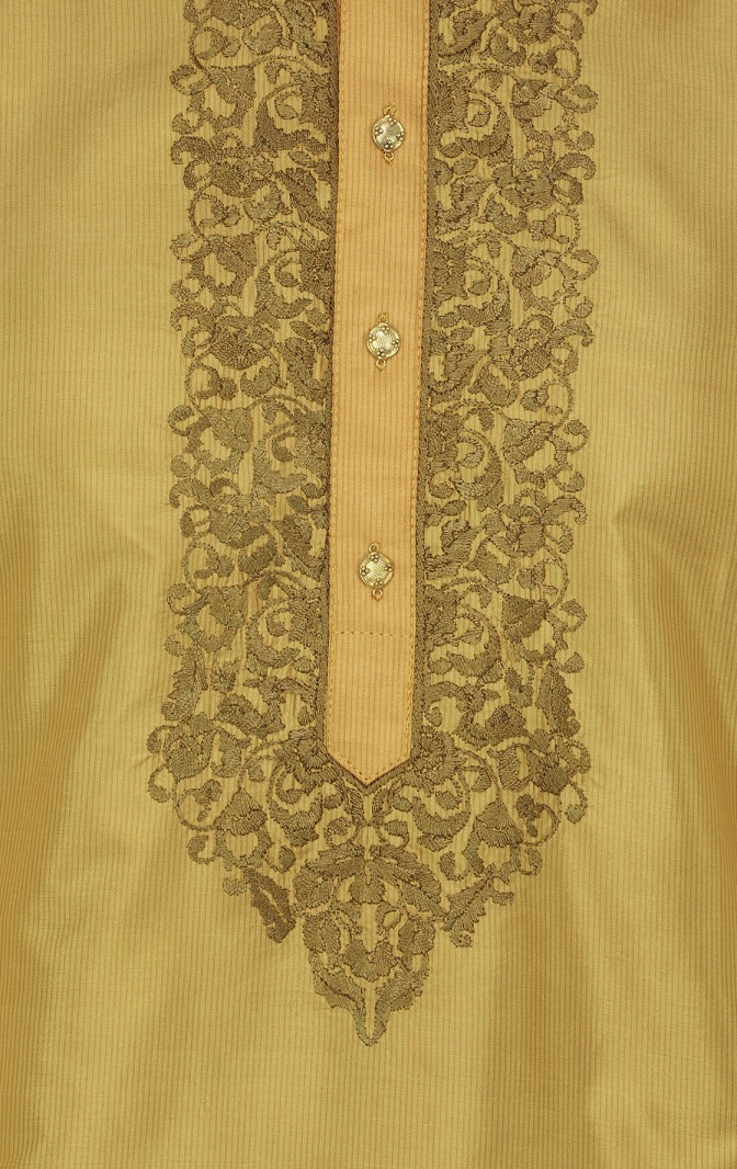 Mustard silk panjabi with embroidery and dual side in-seam pockets. Embroidery work is completed with olive thread. Pair up with aligori, shalwar or churidar pajama.