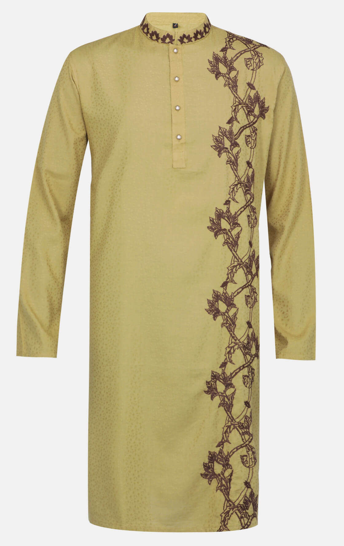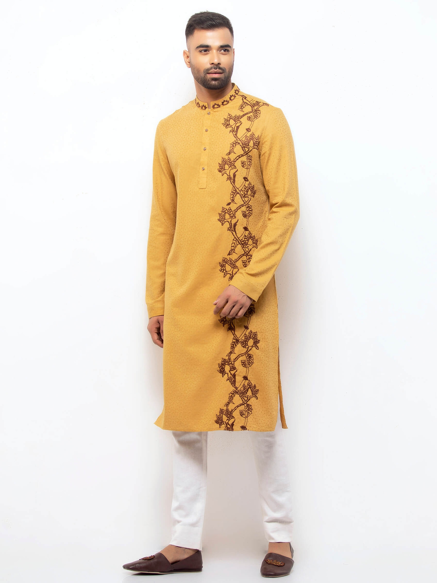 Mustard jacquard viscose-cotton panjabi with embroidery and dual side in-seam pockets. Embroidery work is completed with deep brown thread.