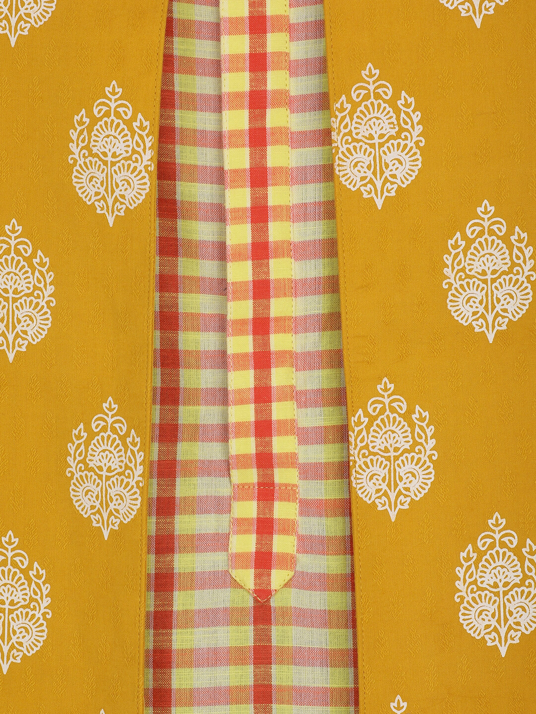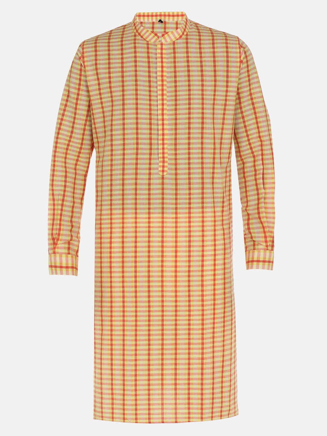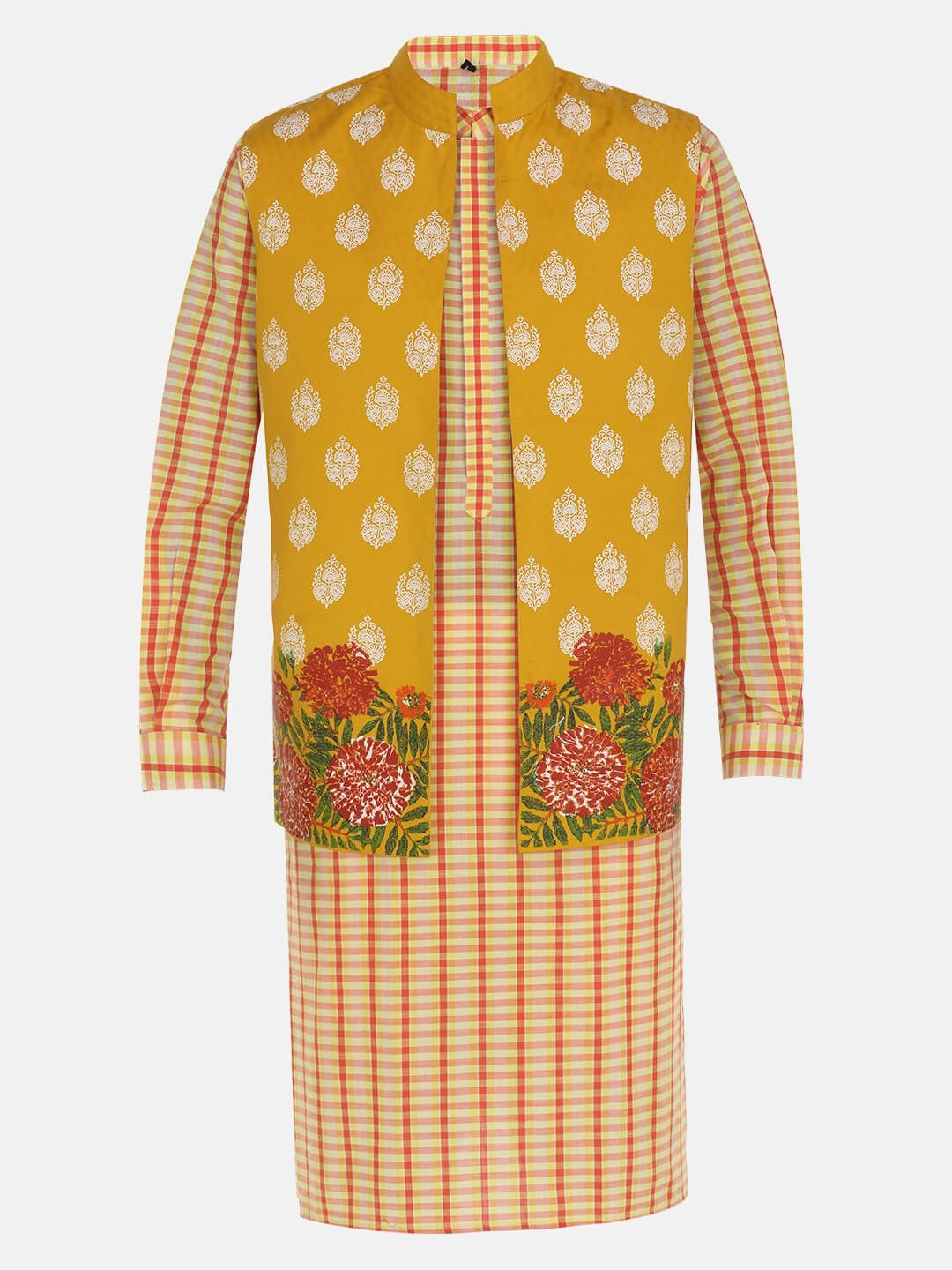 Yellow and red weaved cotton panjabi with in-seam side pockets. Comes with white cotton pajama and mustard printed jacquard cotton coaty.