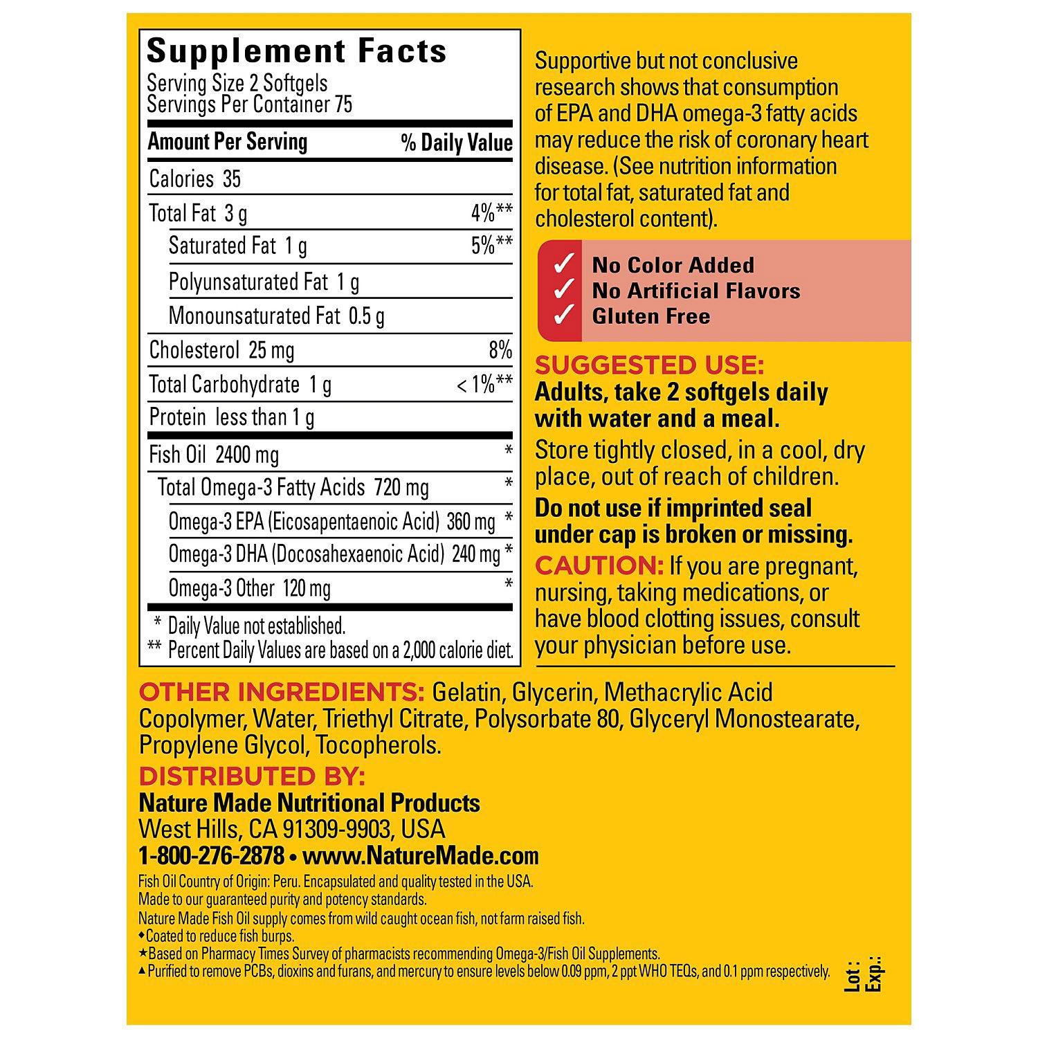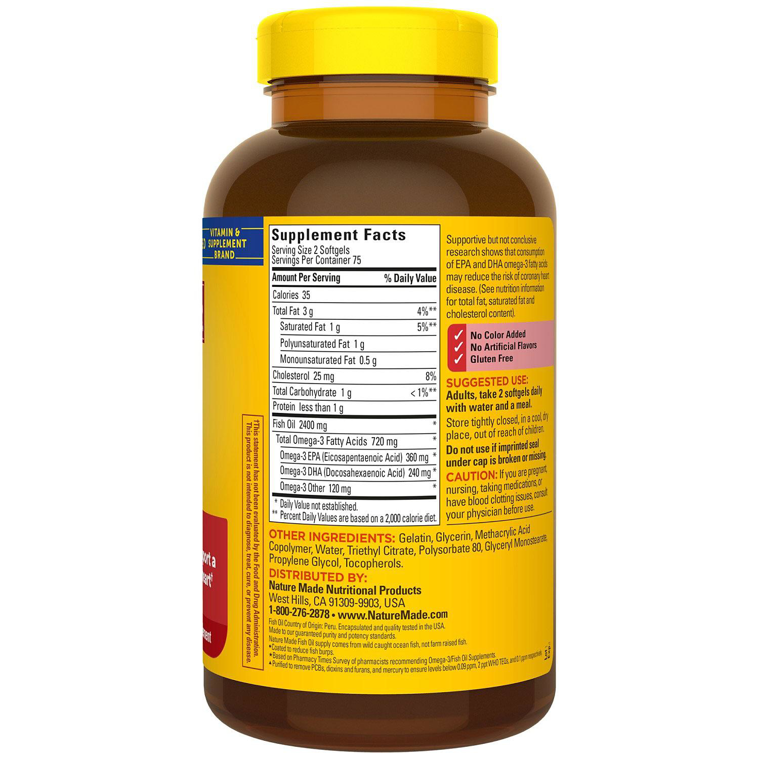 New look, same product. Trust your heart health with Nature Made® Fish Oil, purified to remove mercury.† Every two softgels provides 720 mg of heart-healthy omega-3 (600 mg EPA/DHA).† The omega-3 (EPA and DHA) in fish oil help support a healthy heart.† Nature Made® supports leading heart health experts who recommend consuming 250–500 mg of EPA/DHA per day to help support a healthy heart.† Nature Made Fish Oil supply comes from wild-caught ocean fish, not farm-raised fish