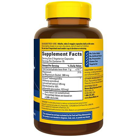 Looking for calmness and relaxation? Nature Made’s Calm & Relax is clinically proven to reduce stress and relax your body. ‡ Each serving (2 capsules) contains 125mg of Sensoril® Ashwagandha which is clinically proven to reduce stress, and 300mg of magnesium to support muscle relaxation. ‡ Experience the whole-body calm and relaxation you are looking for with Nature Made’s Calm & Relax.†