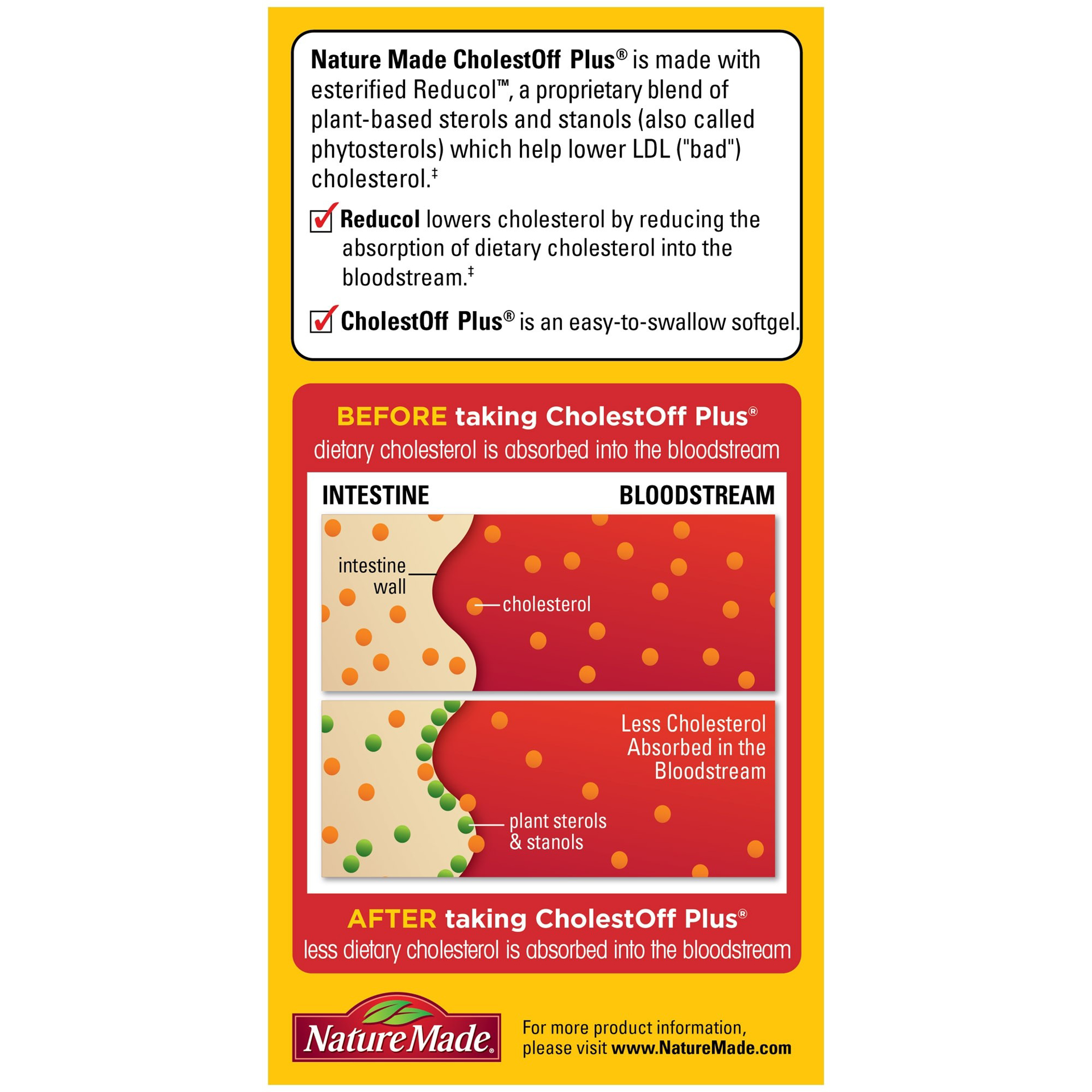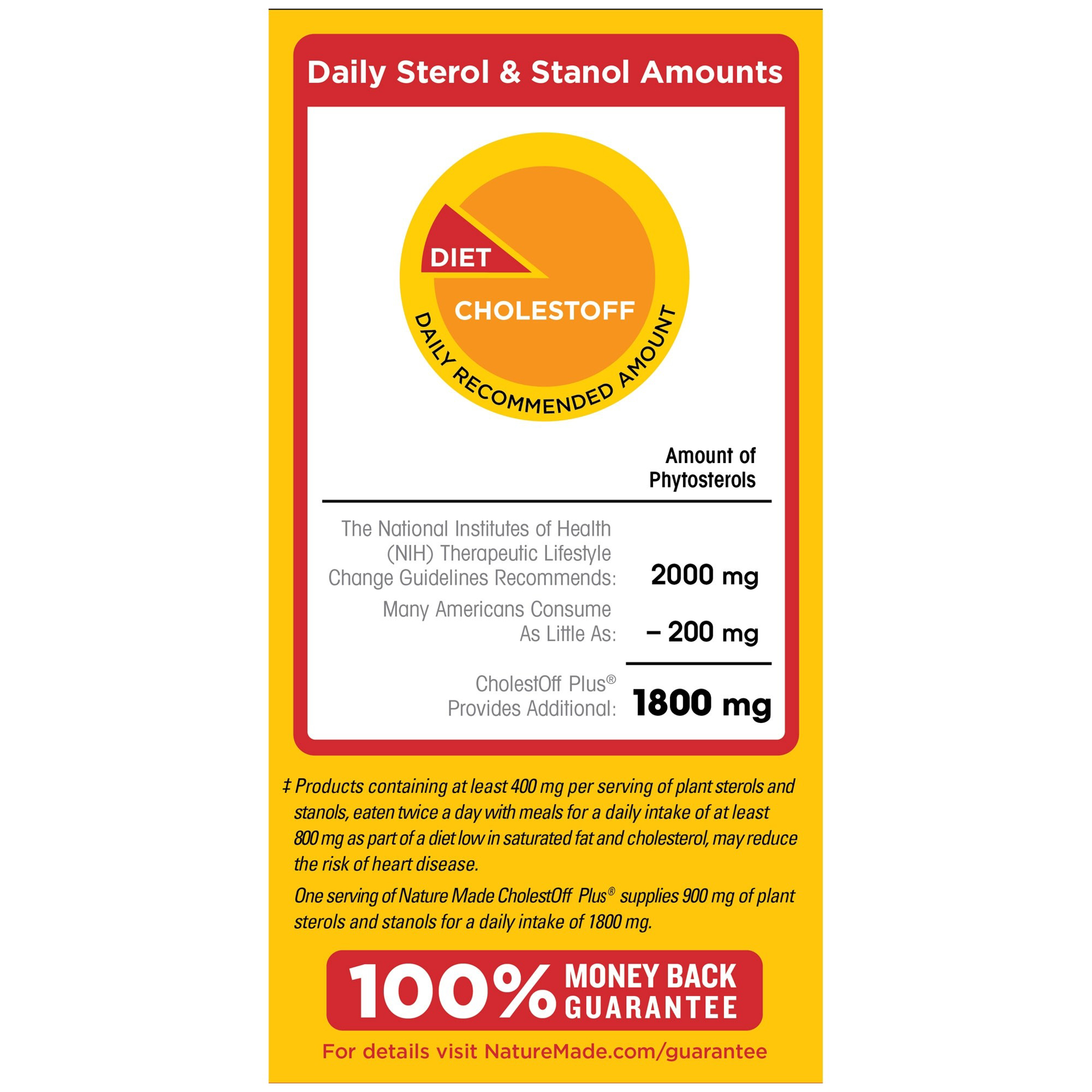 One serving of Nature Made® CholestOff Plus® supplies 900 mg of plant sterols and stanols for a daily intake of 1,800 mg. †These statements have not been evaluated by the Food and Drug Administration. This product is not intended to diagnose, treat, cure, or prevent any disease.