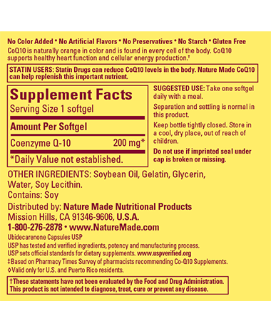 Nature Made CoQ10 200 mg helps support healthy CoQ10 levels in the body, and is naturally orange in color, made with no added colors.