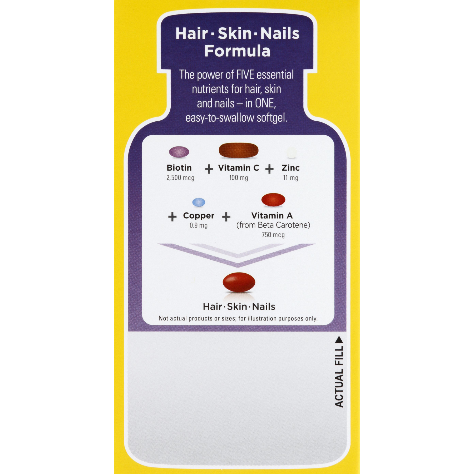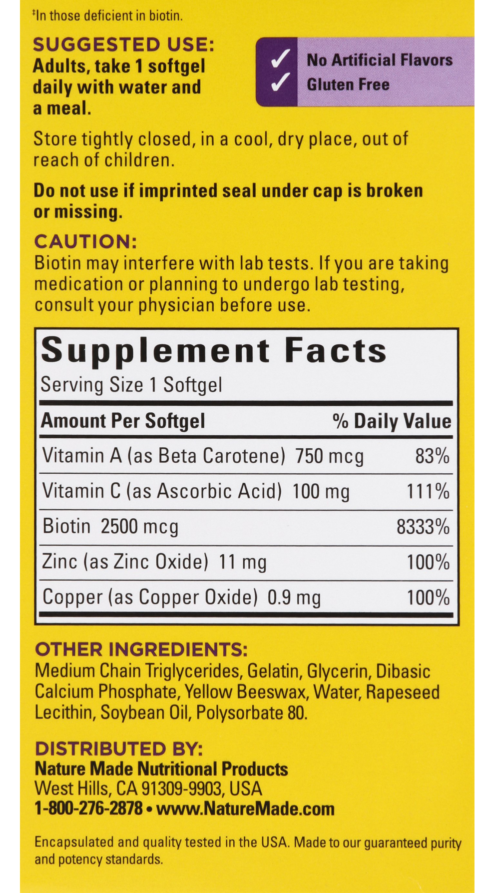 Biotin - May help maintain healthy hair, skin, and nails in individuals lacking sufficient biotin. A daily dose of 2500 mcg of Biotin is Nature Made's Extra Strength recommendation. Vitamin C - Supports collagen synthesizing - Helps support health skin copper - Essential for collagen synthesis and skin support. Beta-Carotene - A precursor to Vitamin A, which is essential for healthy skin Directions Take 1 soft gel daily, with a meal. Free Of Added color, artificial flavors, preservatives, yeast, starch and gluten. Disclaimer These statements have not been evaluated by the FDA. These products are not intended to diagnose, treat, cure, or prevent any disease. Nature Made Hair, Skin, Nails With Biotin Softgel, 2500 Mcg, 60 Ct