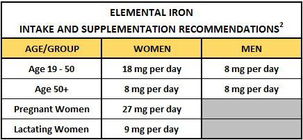 The Recommended Dietary Allowance (RDA) for iron is 8 mg per day for men while the RDA is 18 mg per day for premenopausal women.2