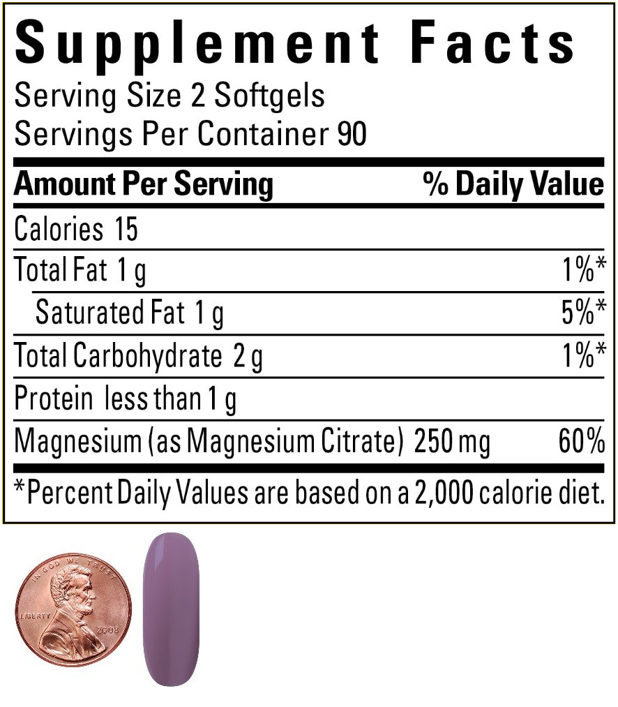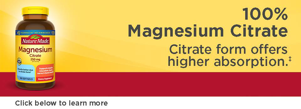 Nature Made® Magnesium Citrate is 100% magnesium citrate, a highly absorbable form of magnesium, to help meet daily needs for this essential nutrient. Information from The National Health and Nutrition Examination Survey (NHANES) shows that 55% of the US population has inadequate dietary intake of magnesium.1 Magnesium participates in more than 300 reactions in the body and is critical to many bodily functions such as helping to support nerve, heart, and muscle function, healthy bones and teeth, and assisting with converting carbohydrates, protein, and fat into cellular energy.2,3†