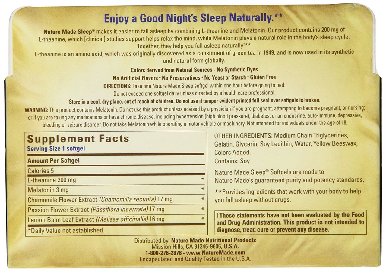 Nature Made Sleep Natural Sleep Aid is guaranteed to meet our high quality standards – it is made from carefully selected ingredients under strict manufacturing processes.