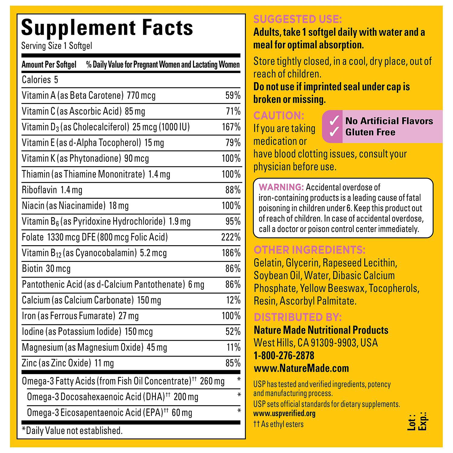 This formulation provides key vitamins and minerals for nutritional support before and during pregnancy. For women who are pregnant and women who are trying to get pregnant, this vitamin will enrich your body. Nature Made Prenatal Multi + DHA is an easy to swallow pill that is clinically proven for the absorption of key nutrients. These include folic acid and iron. These nutrients are essential to nutritional support before and during pregnancy. Other vitamins include calcium, iron and vitamin D.