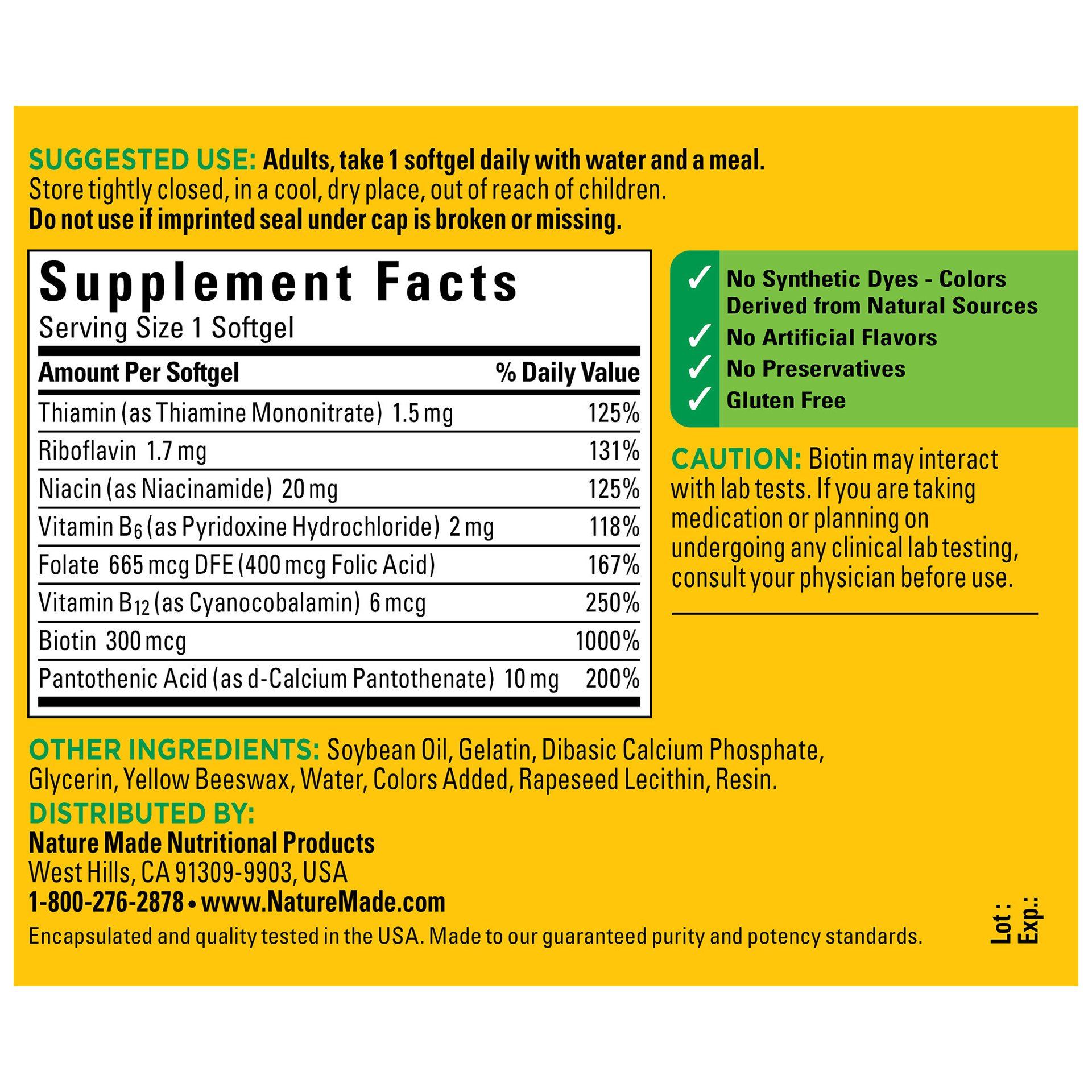 Nature Made® Super B Energy Complex helps convert the food you eat into cellular energy.†B vitamins are also necessary for the normal function of the nervous system.†Made with colors derived from natural sources. †These statements have not been evaluated by the Food and Drug Administration. This product is not intended to diagnose, treat, cure, or prevent any disease.
