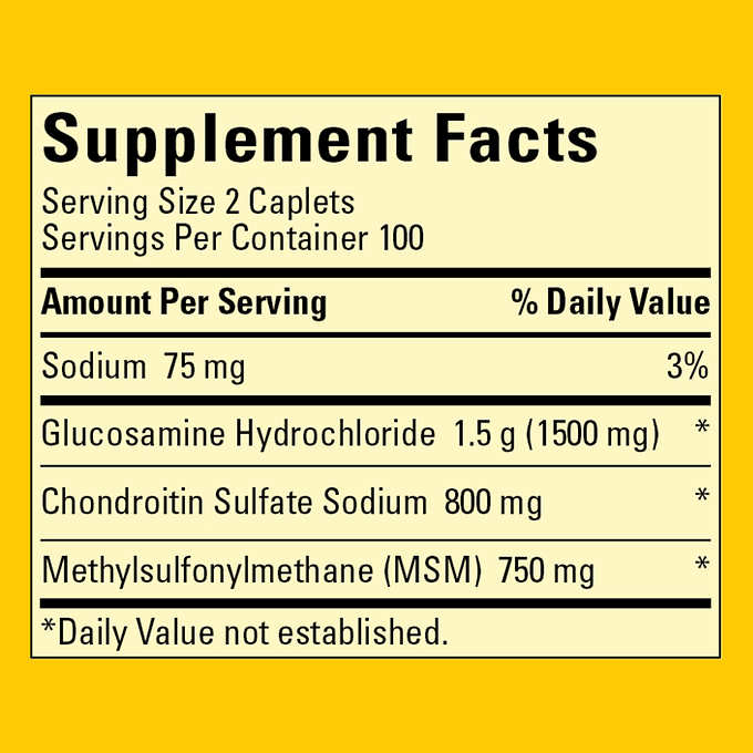Glucosamine 1500 mg., Chondroitin 800 mg., MSM 750 mg., Vitamin D3 50 mcg. per Serving Take 2 Caplets Daily With Water and a Meal. Take 4–6 Weeks to See Results. Results may vary Joint and Muscle Support USP Verified