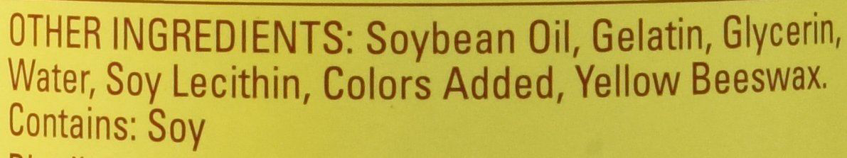 Other Ingredients: Soybean Oil, Gelatin (Porcine), Glycerin, Water, Soy Lecithin, Colors Added, Yellow Beeswax.