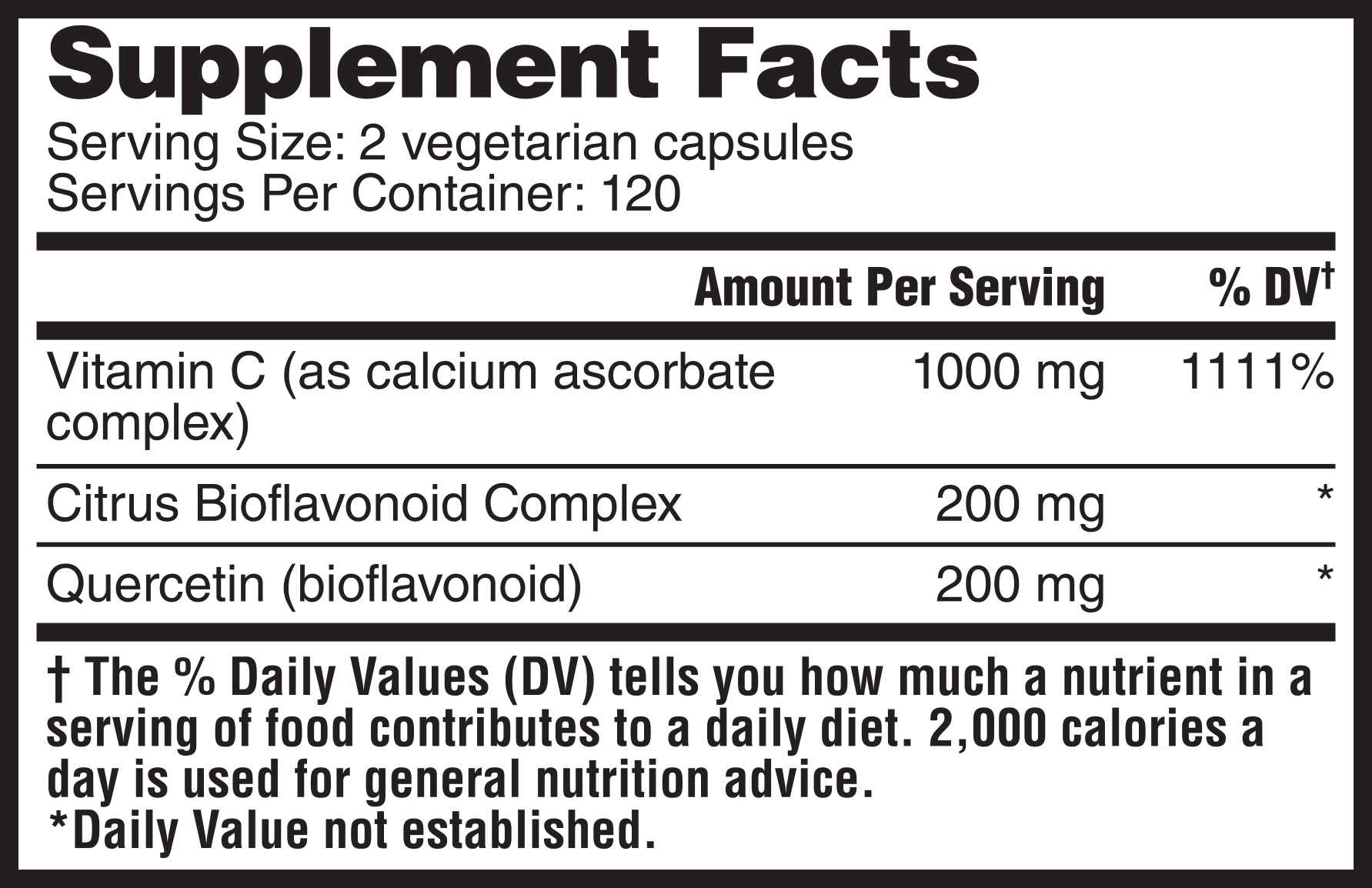 Non-Acidic Vitamin C 1,000 mg. Per Serving. Quercetin 200 mg. and Citrus Bioflavonoid Complex 200 mg. Non-GMO. Gluten-Free.