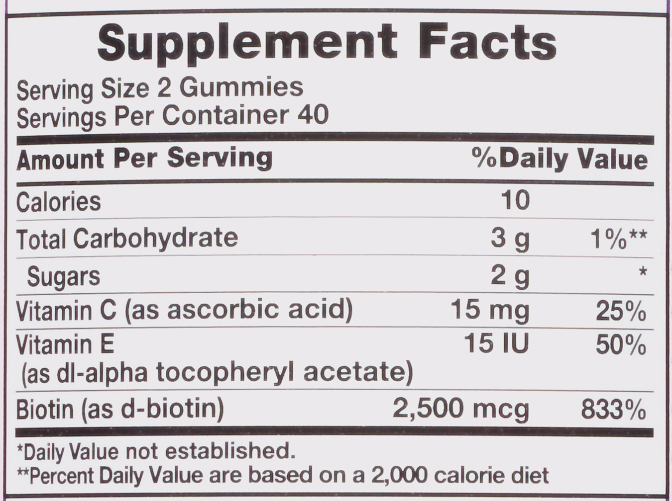 Dietary Supplement. Vitamins. 2,500 mcg biotin per serving. Delicious natural fruit flavor. Gluten free. This unique formula features a synergistic blend of the finest beautifying nutrients designed to help you look your best. Each ingredient has been carefully chosen and formulated to perfect symmetry, providing nourishing support for your hair, skin and nails. Our tasty gummies feature vitamin E for its legendary antioxidant properties that support vibrant skin, vitamin C for its complementary antioxidant activity and its role in the production of collagen, and biotin to promote lush hair and strong, healthy nails. 100% quality guarantee. naturestruthproducts.com. Supports healthy hair, skin and nails. Contains no artificial color or artificial flavor. (These statements have not been evaluated by the Food and Drug Administration. This product is not intended to diagnose, treat, cure or prevent any disease.