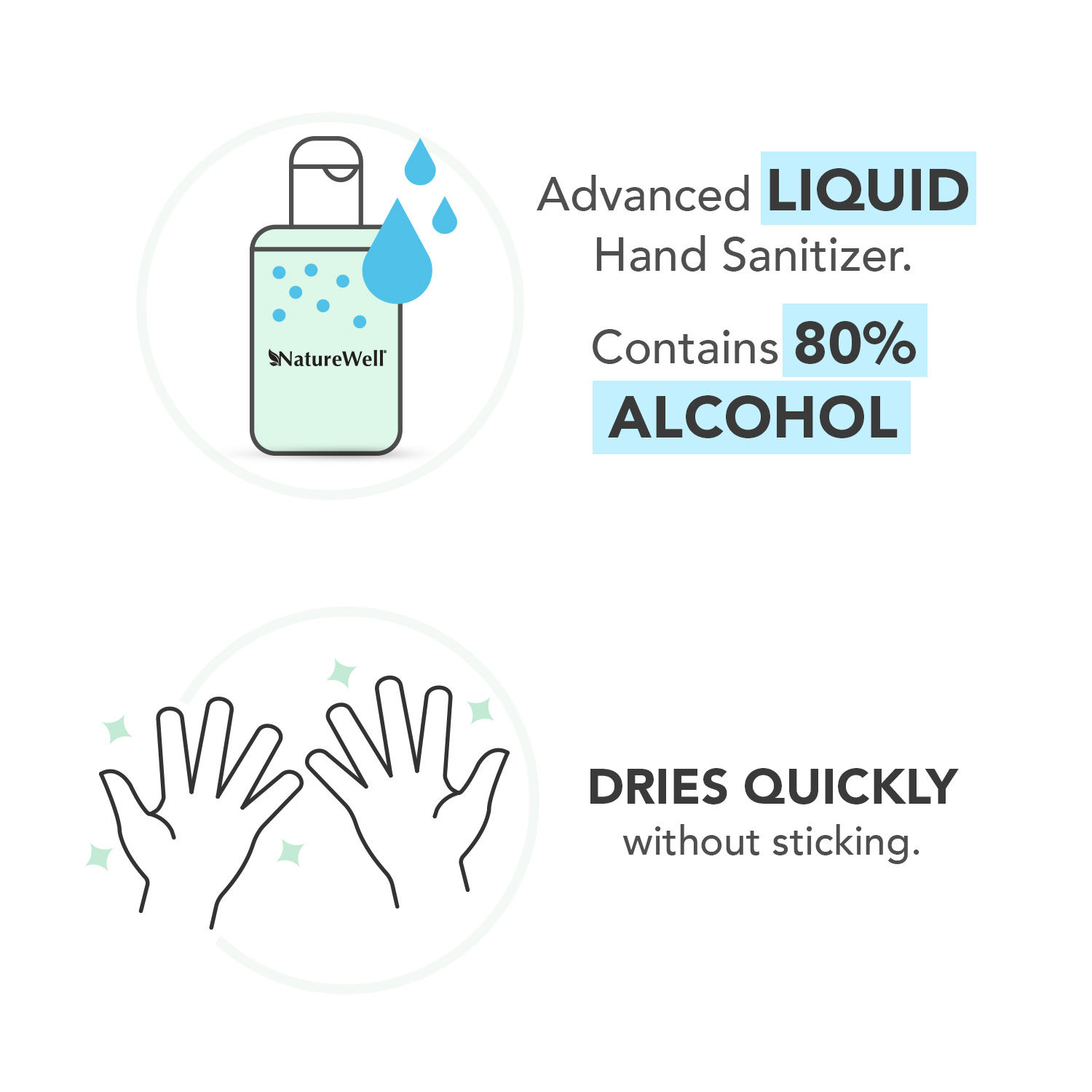 NatureWell® Advanced LIQUID Hand Sanitizer is a quick dry Alcohol Antiseptic 80% Topical Solution that will kill common germs. This formula skips fragrances and oils in favor of efficiency.
