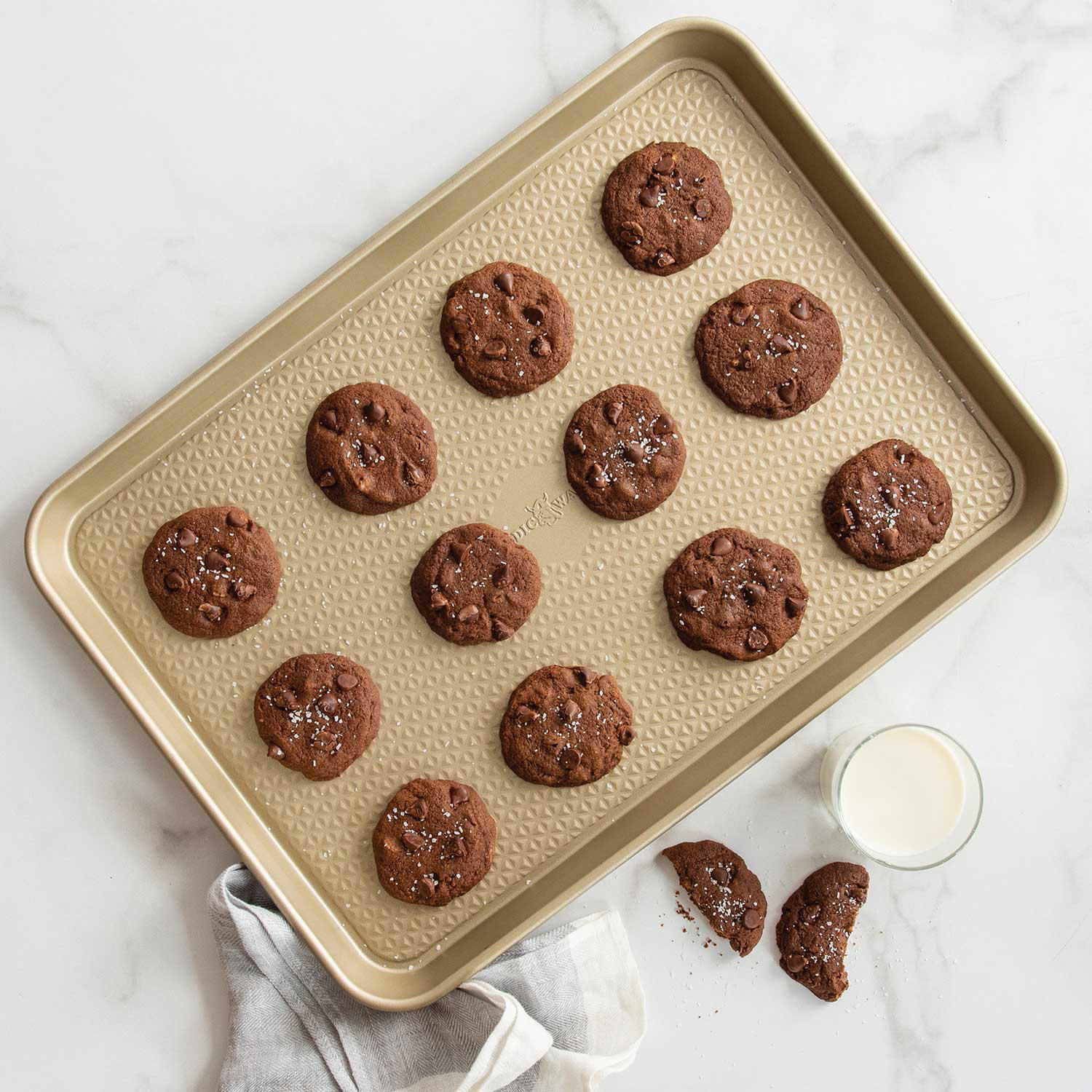 Equally well suited for holiday cookie baking or sheet pan dinners, this 3 pc nonstick baking sheet set delivers an amazing combination of quality, performance and versatility. Made from heavy-gauge nonstick coated steel, these sheet pans feature a gently textured surface that is both beautiful and functional. The subtle embossed texture not only lends added rigidity to your pan's surface, it also helps to improve the release of foods. You might wonder, "Will my cookies have a pattern on the bottom?" but indeed they will not, as the textured patterning is very gentle. Set includes 10x15 inch, 11x17 inch and 14x20 inch sizes for all of your household baking needs. Because of their PFOA-free nonstick coating, these pans release baked foods easily and clean up with minimal effort. Available in rose metallic, silver metallic, and gold metallic finishes, both equally beautiful. Perfect for holiday gifting or for upping your holiday cookie baking game just in time for your cookie exchange party. Recommended before initial use and after subsequent uses, to hand wash with warm, soapy water. Always towel dry pan after washing. Nylon, wood, or silicone utensils are recommended. Metal utensils and scouring pads may scratch the nonstick coating. Do not use a pan on the stovetop or over an open flame. Not broiler safe. To prevent warping, , do not immerse a hot pan into cold water or expose pans to extreme temperature changes. Dark-colored and acidic foods such as barbecue sauce, mustard, or ketchup may stain the nonstick on your pans. This is merely cosmetic and will not affect the coating performance.