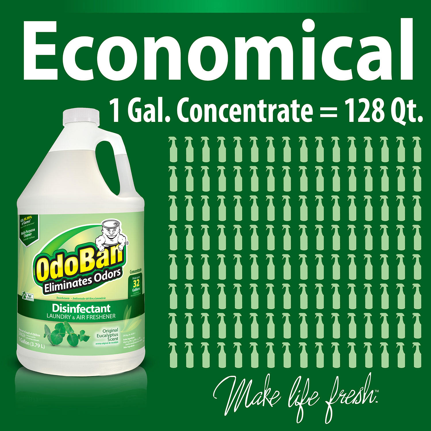 A multi-purpose cleaner, you'll find many ways to use OdoBan Odor Eliminator and Disinfectant Concentrate, Eucalyptus Scent. It can clean a variety of surfaces from carpets to kitchen countertops. Use it as a cleaning solution for everyday tasks like mopping floors, wiping down tables and shining appliances. It is also powerful enough for heavy-duty or deep cleaning such as scrubbing walls, cleaning outdoor furniture, and removing mold and mildew from bathroom tiles. Concentrated, it will make up to 32 gallons of an all-purpose cleaning agent.